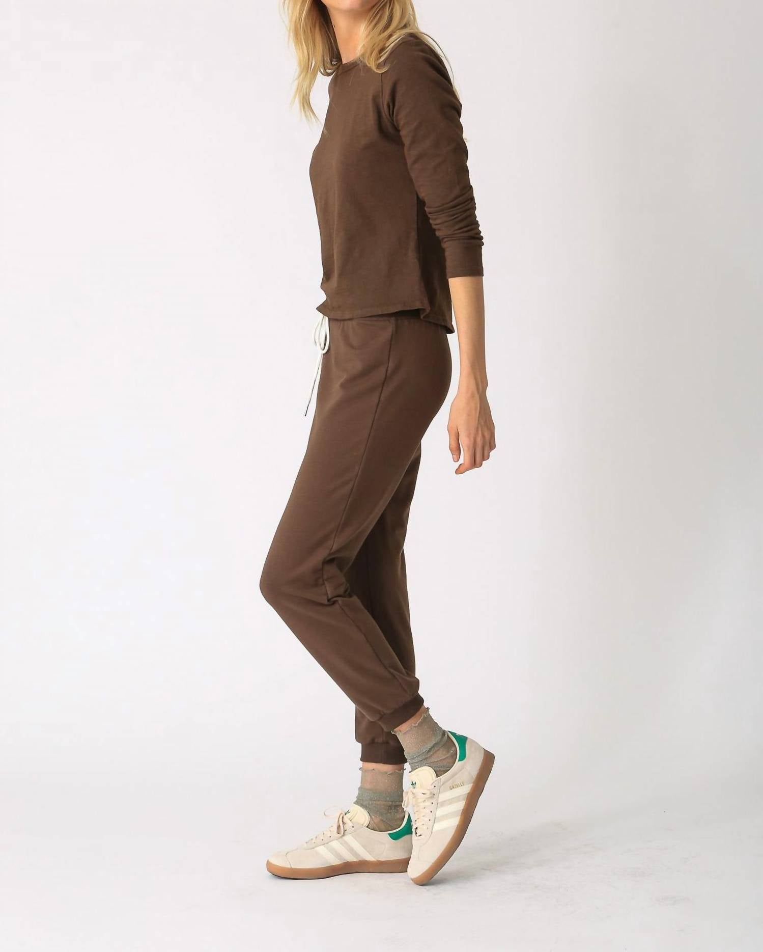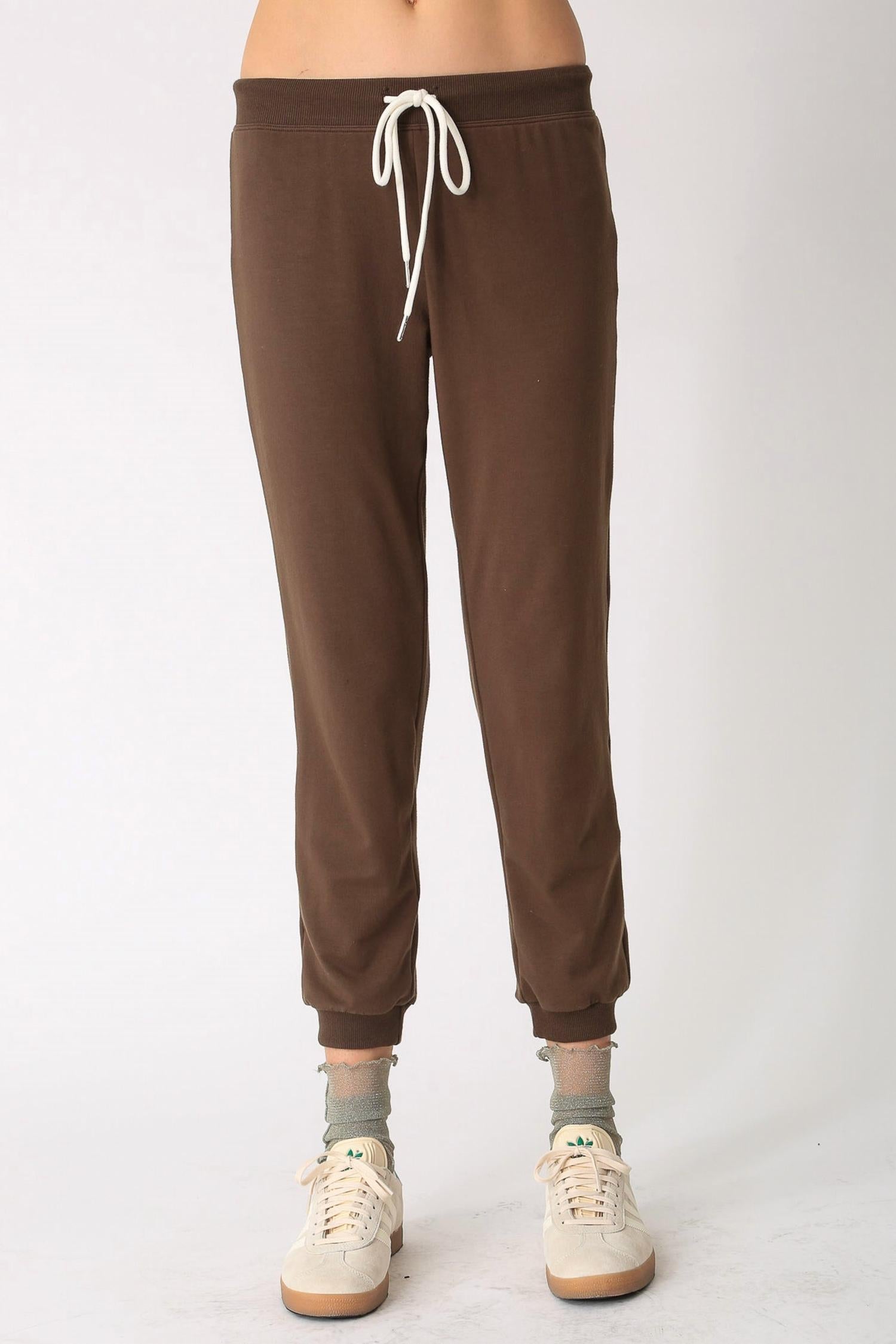 The perfect pant for running around town and looking cool while doing it. Elevate your loungewear collection with the Sunny Slim Fit Jogger by Electric & Rose, crafted from a soft knit blend of 95% Micromodal and 5% Spandex. These joggers feature a solid brown design, with a tie closure for a secure, customized fit and a tapered leg style that complements any casual ensemble. Made in the USA, they offer a slim fit that ensures both comfort and style, making them perfect for vacation wear during the fall season. Care is simple with machine wash and tumble dry on low.