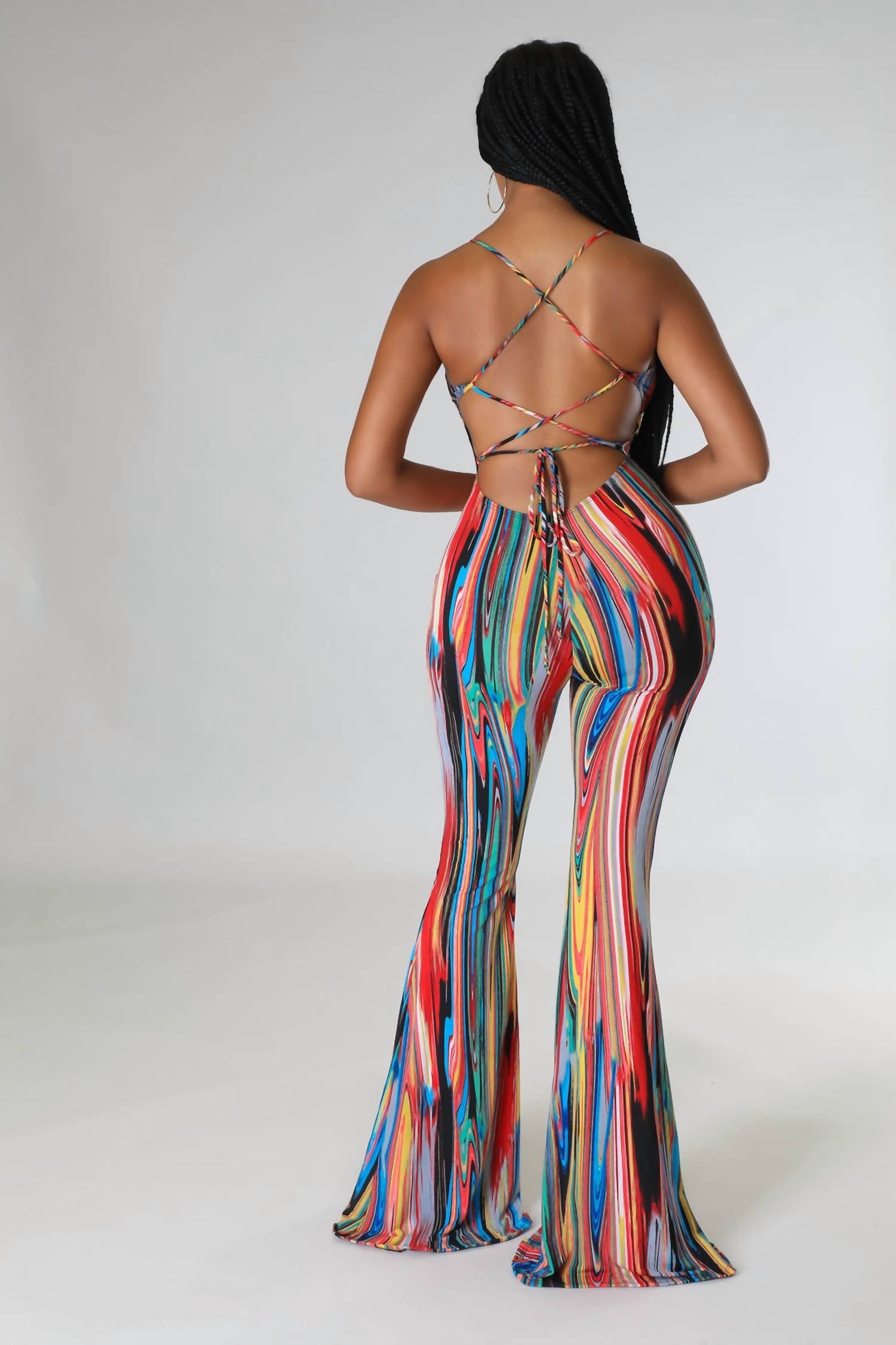 Introducing the Color Me Mine Jumpsuit by Good Time USA, a vibrant addition to your wardrobe with a unique patterned design. This women's jumpsuit features a flattering high-rise waist, relaxed fit, and stylish flared legs. Designed for ease, it offers a criss-cross tie back with a convenient tie closure. Perfect for any occasion, it effortlessly combines comfort and style.