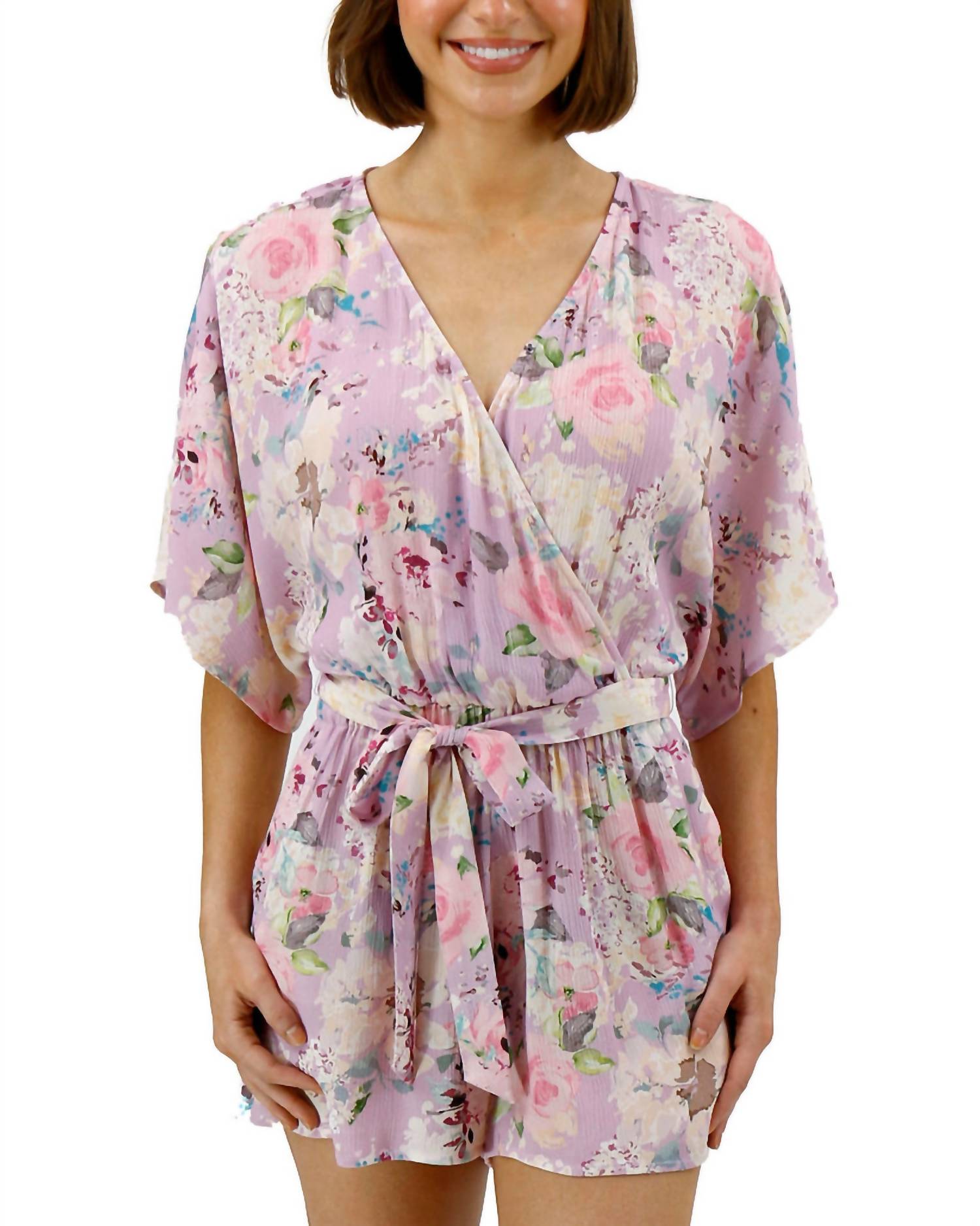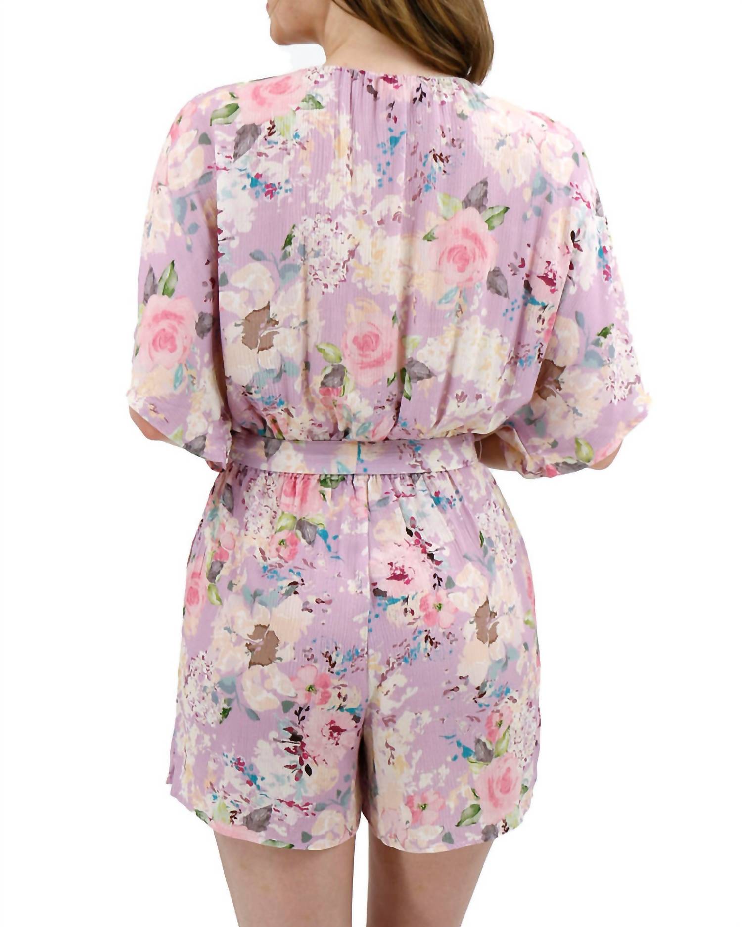 This purple floral romper features functional side pockets, breezy dolman sleeves, and a shorts romper design. A bust button provides extra coverage, while the removable waist tie creates a flattering silhouette. Made from 100% rayon. Machine wash cold, line dry.