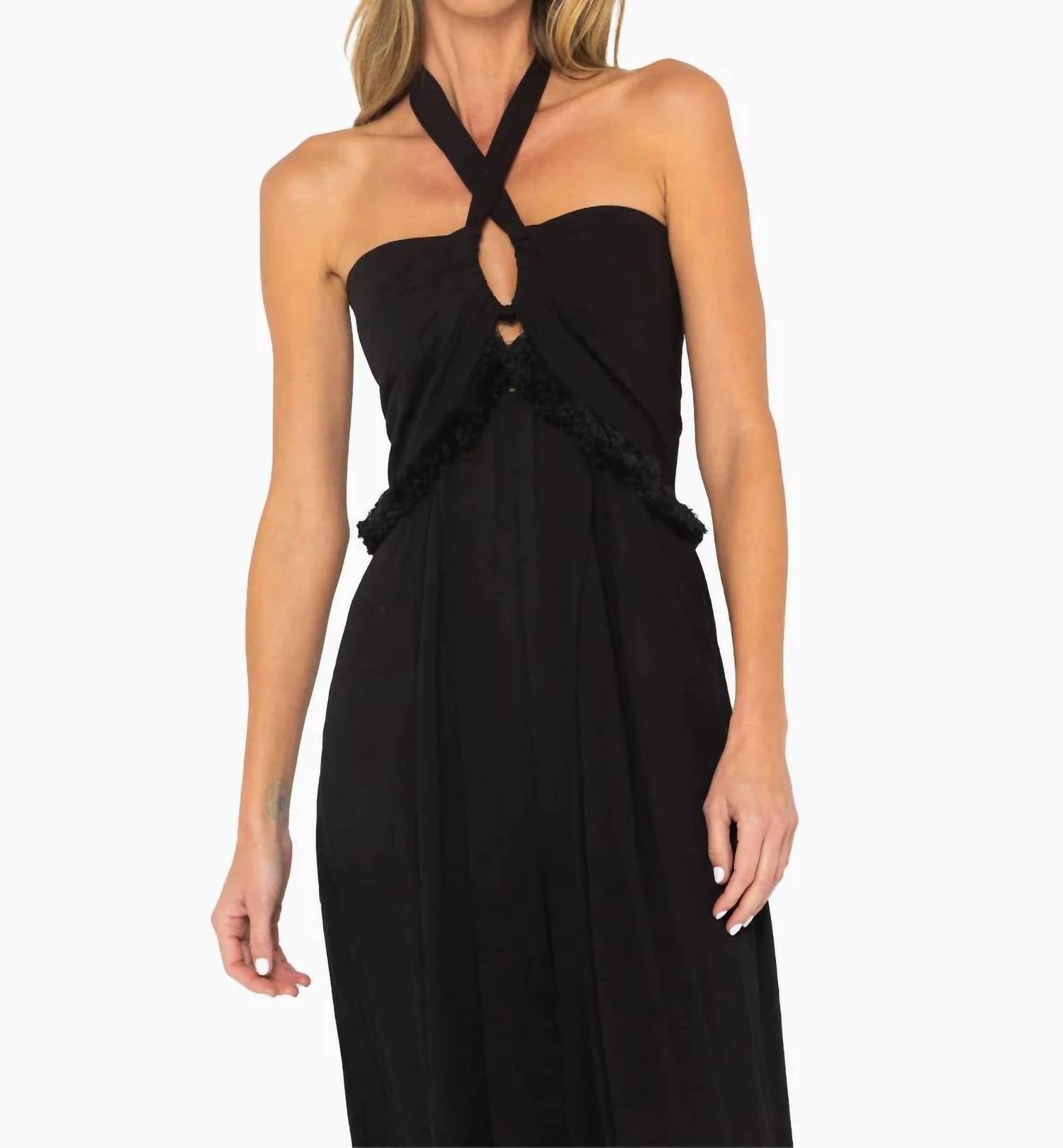 The perfect outfit choice when you you need something quick to throw on and still want to look efforlessly cool. Elevate your summer wardrobe with the Esme Halter Jumpsuit by JBQ, a chic one-piece solution in a sophisticated hue. Crafted from 100% cotton and made in the USA, it features a halter neck and a bust cut-out enhanced with fringe trim for a playful touch. The jumpsuit boasts an ultra-wide leg and relaxed fit, promising comfort with every step, and is equipped with a convenient back zip closure. Perfect for vacation, the solid pattern and 90s fashion trend make it a standout choice for any getaway.