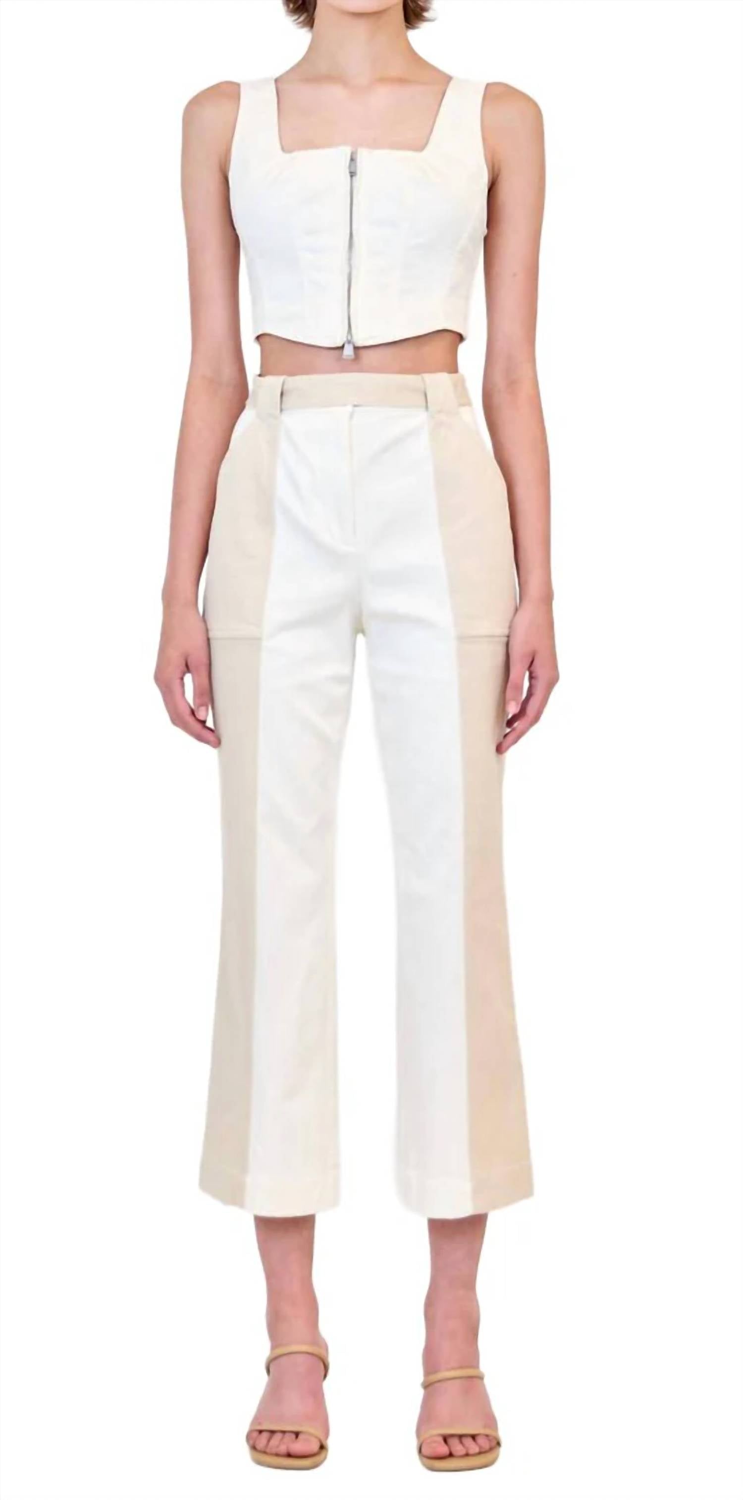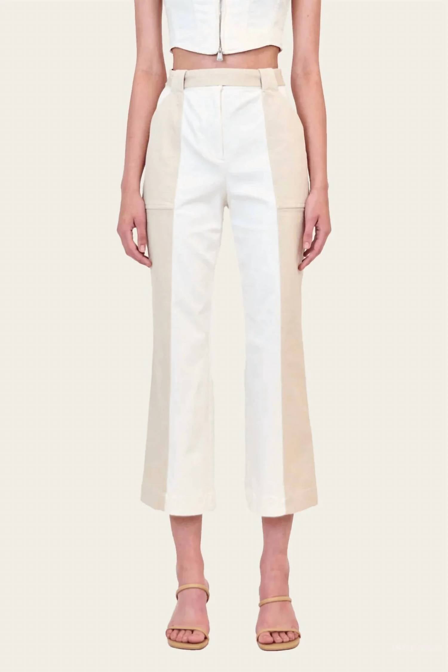 The Liza Cropped Pant in Ivory Multi features a two-tone cream design made from 52% cotton, 45% viscose, and 3% elastane. It has a cropped length and a modern, refined fit. Imported.