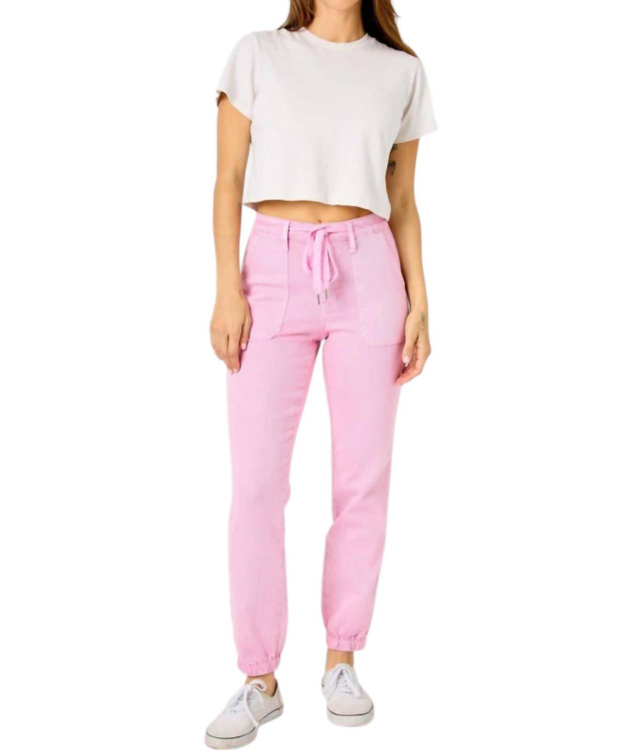 The perfect pant for running around town and looking cool while doing it. High Rise. Button Closure with Functional Drawstring. Zip Fly. Garment Dyed Finish. Jogger Silhouette. 93% Cotton, 6% Polyester, 1% Spandex. Machine Wash.