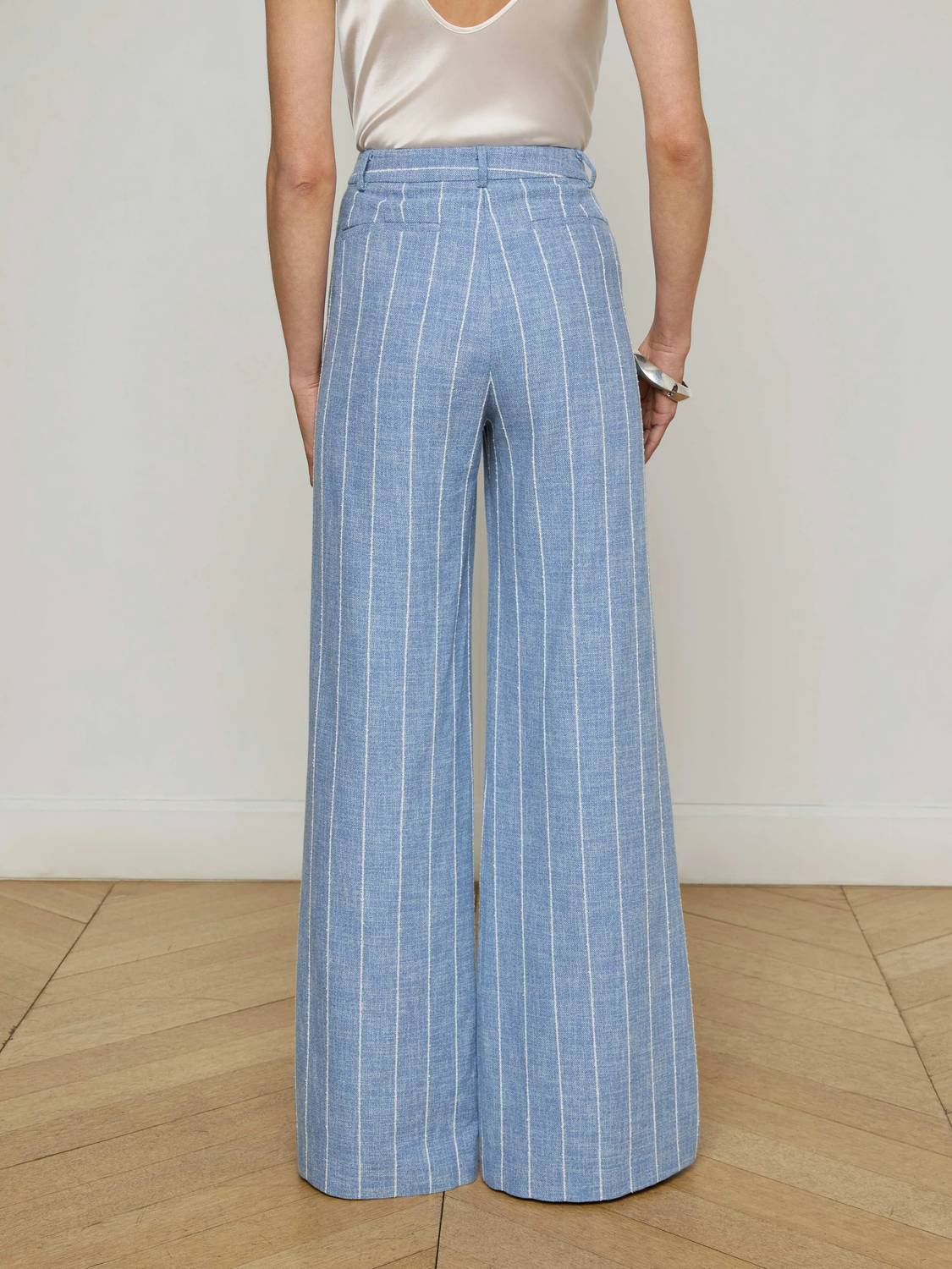 Refreshing sky blue with elegant pinstripes, perfect for any evening event this fall season. High-rise trousers, made from an Italian cotton blend, feature a zip fly with a hook and bar closure for a secure fit. With convenient slant and back welt pockets, these pants offer both style and functionality. Composed of 54% Cotton, 32% Viscose, 12% Polyester, 2% Other. Imported. Dry clean only, cool iron on reverse if needed. Model is 5'9" and wearing a size 2; dimensions include a rise of 11.25", inseam of 34", and leg opening of 14.4".