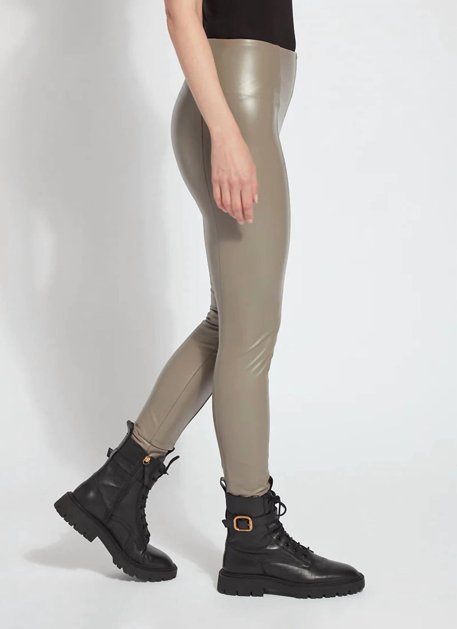 The legging you didn't know you needed and you won't want to take off. Elevate your style with the Hi Waist Vegan Leggings by Lysse, crafted in stunning taupe for a chic, minimalist look. These high-rise leggings feature a concealed patented waistband and sleek skinny leg design for a body-hugging fit. Composed of 100% Polyurethane, they boast four-way stretch and body-lengthening seams, tailored to perfection with a 29" inseam and 11" rise (size M). The pull-on closure ensures comfort, and special care includes washing them inside-out.