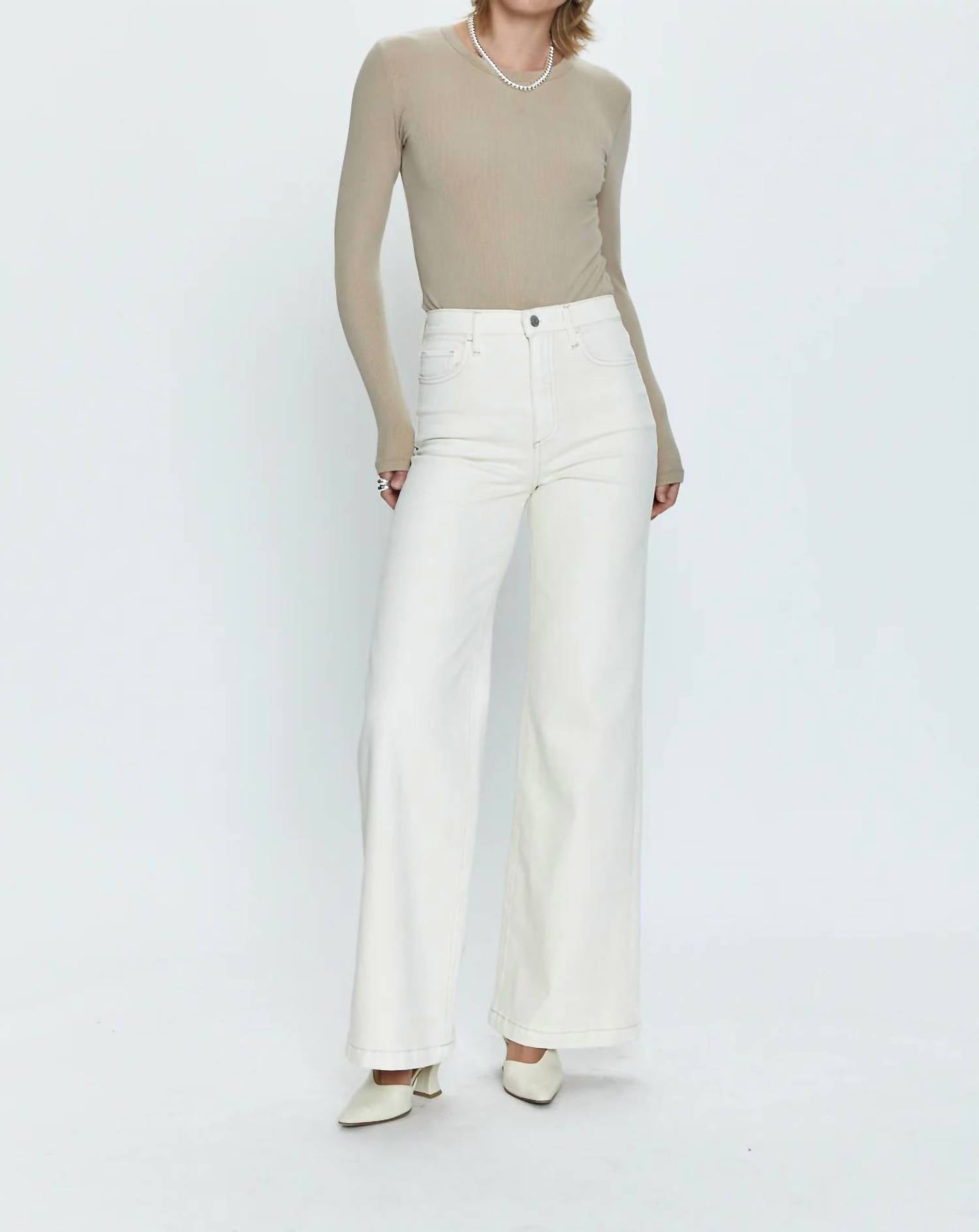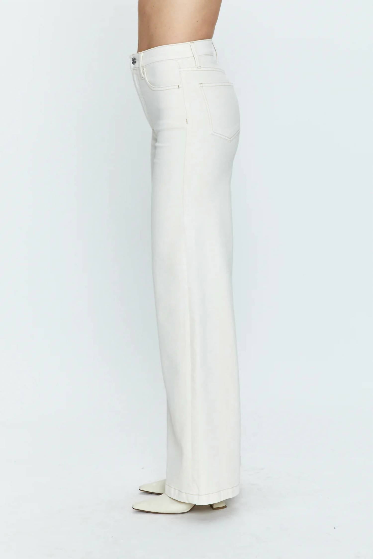 Step back in time with the Lana High Rise Ultra Wide Leg Denim Pants from PISTOLA, a perfect blend of retro flair and modern comfort. Crafted from a cotton blend with a composition of 72% cotton, 27% polyester, and 1% spandex, these pants offer a relaxed fit with comfort stretch for all-day wear. The high-rise, wide-leg design in a solid ecru color features a button closure and functional pockets, making it a versatile choice for any wardrobe. Ideal for spring streetwear or travel occasions, embrace the trend of wearing white all year round.