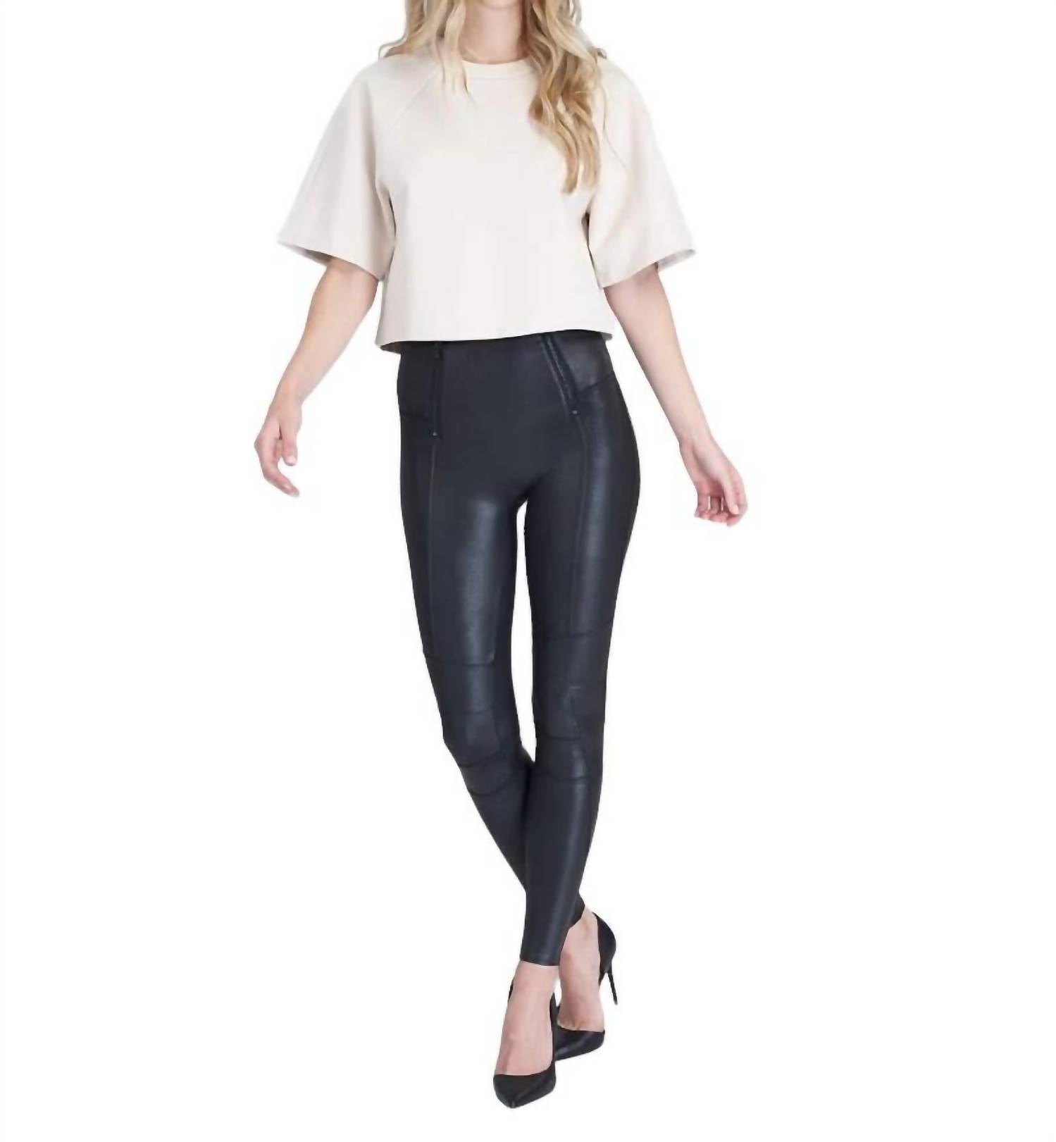 You'll be reaching for this best-selling legging all season long. These leggings feature sleek and smoothing faux leather fabric that shapes and lifts, with a contoured Power Waistband for core compression. The high-waisted design is center-seam free, preventing camel toe. Versatile for dressing up or down, they are made from 87% nylon and 13% elastane with a polyurethane coating, and lined with 80% polyester and 20% elastane. Machine wash cold. True to size.
