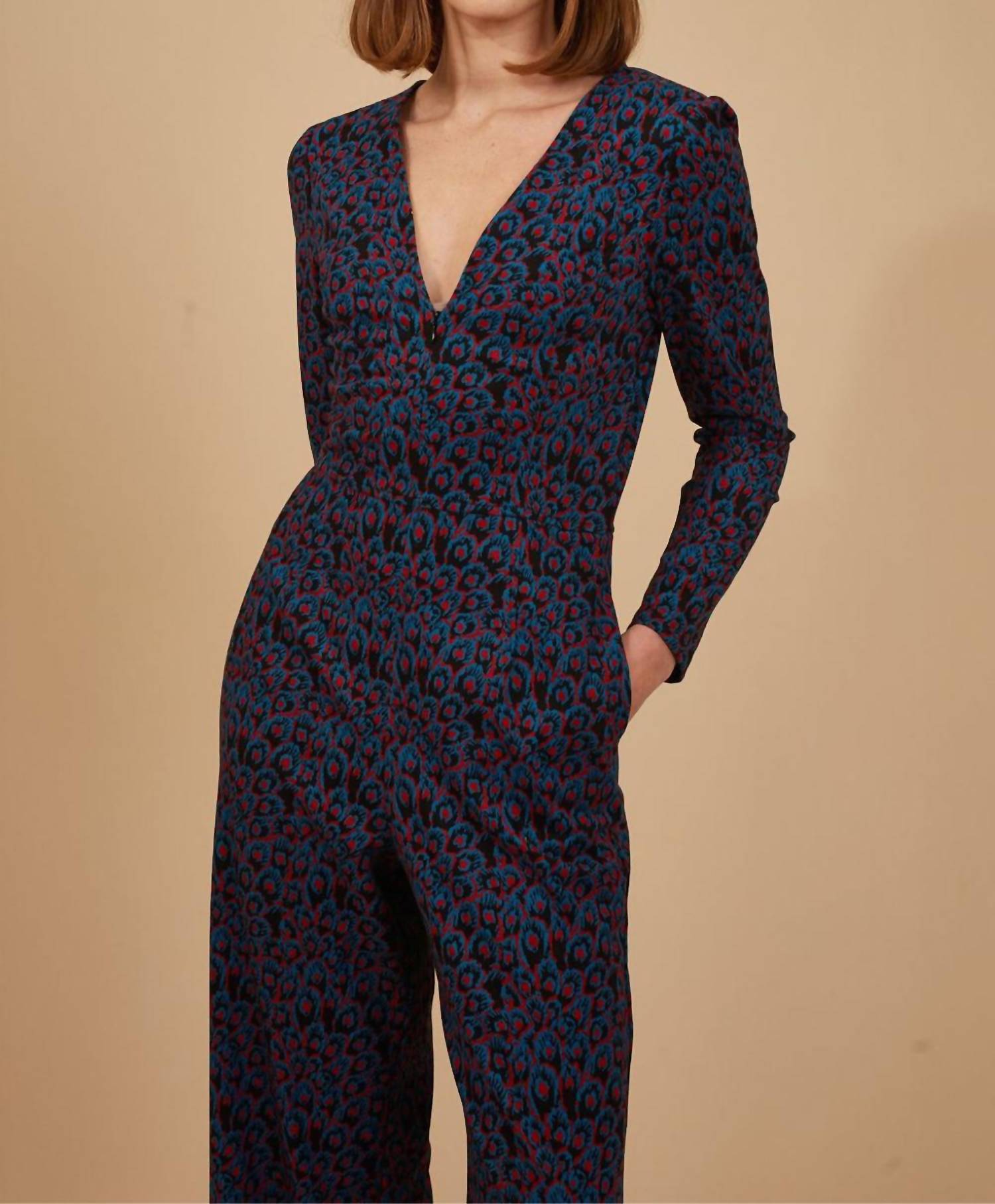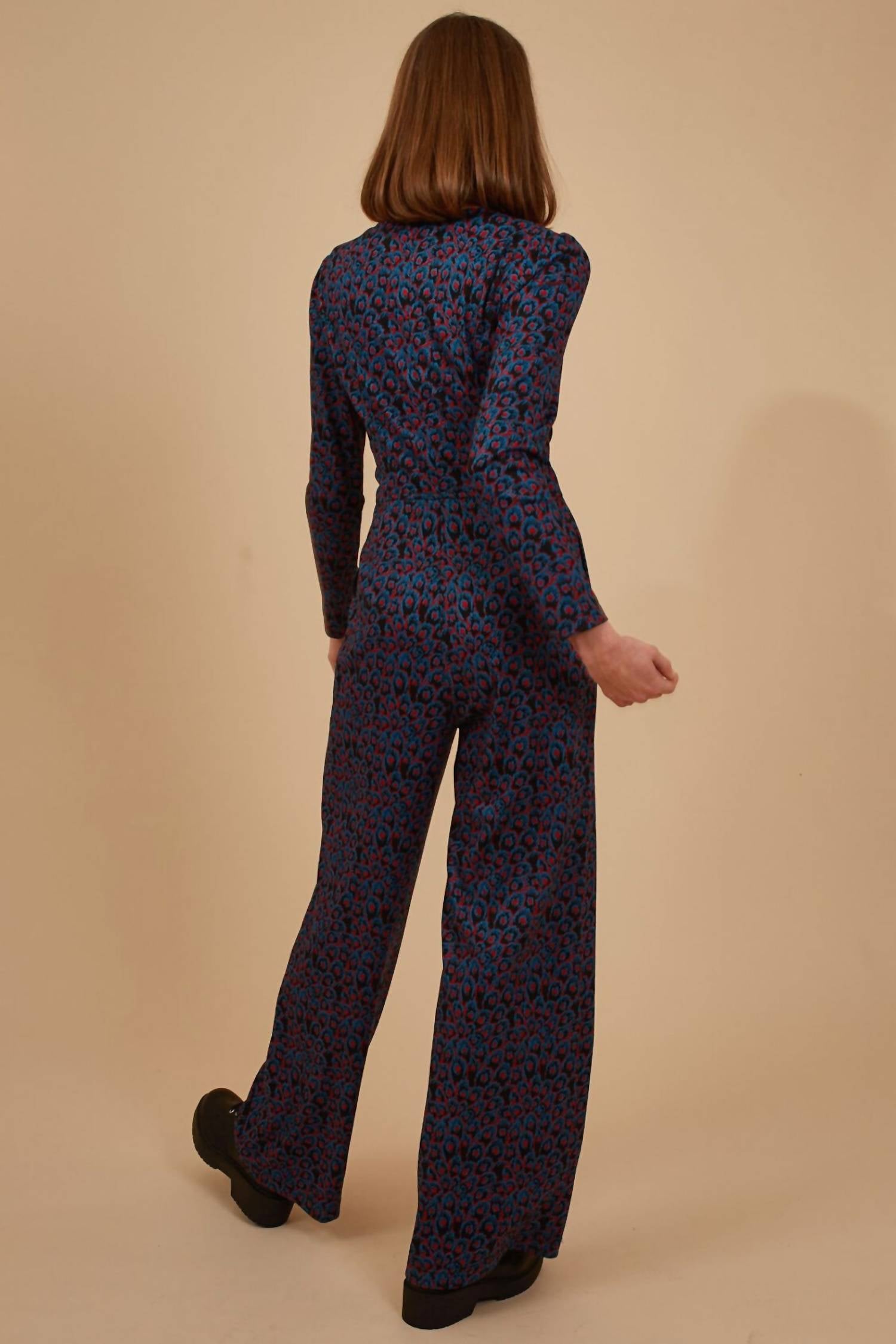 It doesn't take much for this one piece to look effortlessly cool. Add some statement jewelry to dress it up, or throw on some sneakers for a more casual vibe. Introducing the Zelda Jumpsuit by Traffic People, a statement piece perfect for adding a sultry edge to your autumn wardrobe. This jumpsuit features long sleeves and a wide-leg design, with a V-neck and convenient front zip closure adding style and functionality. Crafted from a composed blend of 85% Viscose, 10% Wool, and 5% Elastane, it combines comfort with a bold blue and red print. Care instructions advise machine washing cold and line drying for lasting wear.
