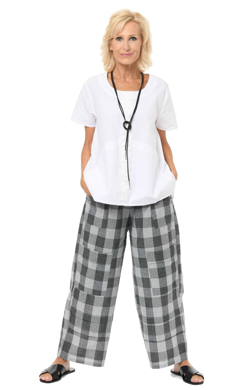 Introducing the Metro Pant by Tulip Clothing, a relaxed-fit, high-rise wide leg pant perfect for a preppy spring style. Crafted from 100% cotton in Lexington Plaid, these pants feature a full elastic waist with a practical pull-on closure. Designed with both functional pockets below the waistband and decorative pockets on the knee, they offer ease and style. With an inseam of 26 inches on all sizes, length ranges from 37.75 inches to 38.75 inches depending on size, making them ideal for a comfortable and fashionable look on housewarming or Mother's Day occasions.