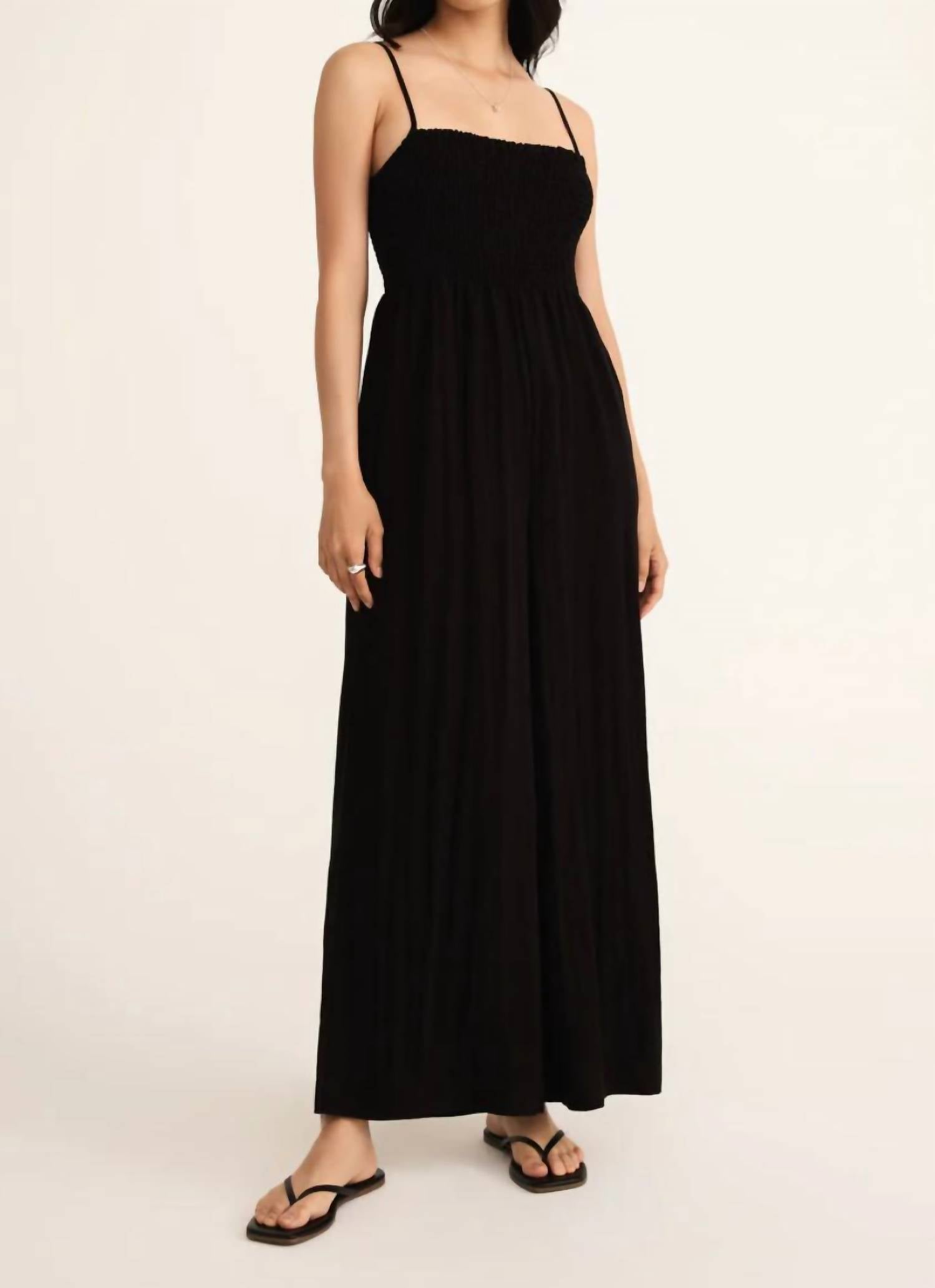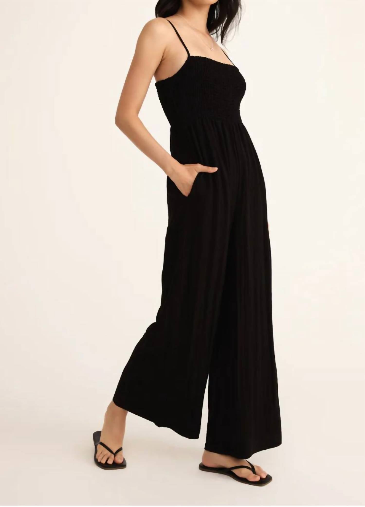 The perfect outfit choice when you you need something quick to throw on and still want to look efforlessly cool. Introducing the Z Supply Beachside Romper, an ankle-length jumpsuit perfect for summer. This stylish piece features spaghetti straps, a smocked bodice, a square neckline, and convenient pockets. Crafted from 90% Rayon and 10% Nylon, it offers a relaxed fit with a pull-on closure. Care instructions specify machine wash for easy maintenance. Model is wearing a size small, and it runs true to size with a relaxed fit.