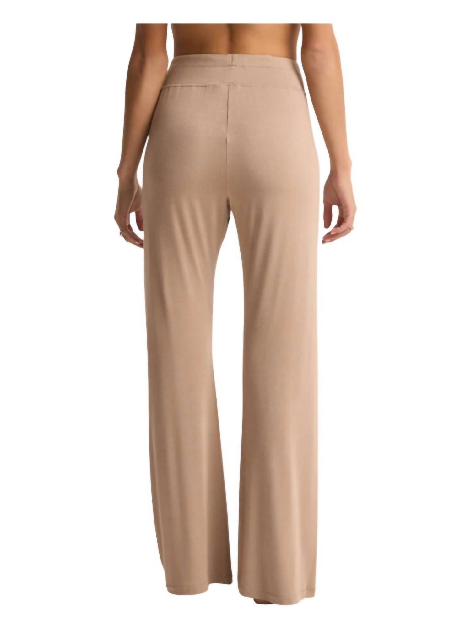 These pants feature a drawstring waistband and a high rise, with fit and flare full-length legs for a relaxed fit. Made from a blend of 46% special viscose, 46% modal, and 8% spandex, they are machine washable in cold water.