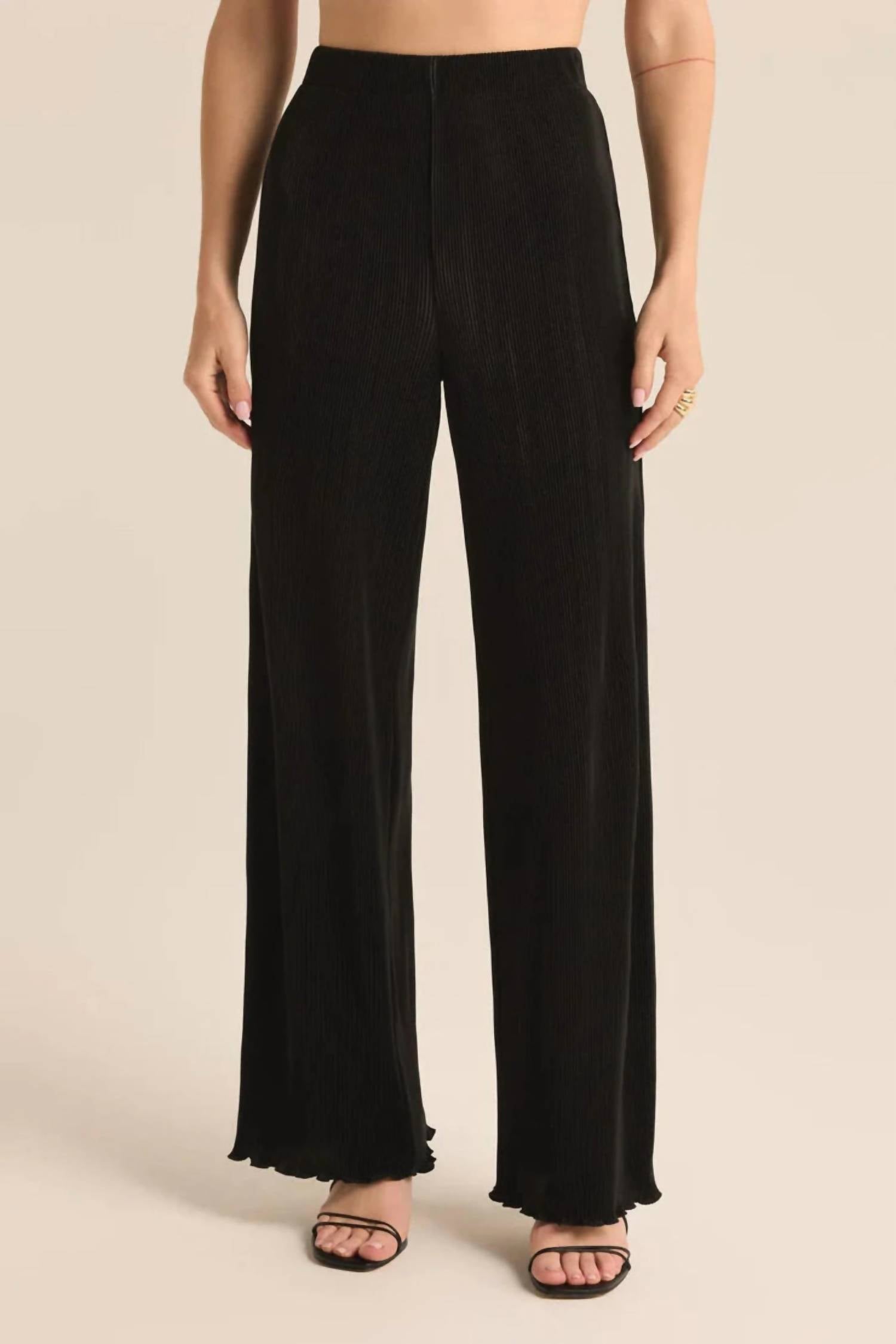 A straightleg pant that workes season after season. Dress these up with your favorite blouse or keep it casual with your go-to tee. Discover the Plissé High Rise Pant by Z Supply, a perfect blend of style and comfort in classic black. Featuring an elastic waistband and lettuce hem, these straight-leg pants are crafted from 100% polyester for a textured feel. The pull-on closure offers ease and the lightweight plissé fabric ensures an effortless fit. Care instructions suggest laying flat to dry for maintaining the look.