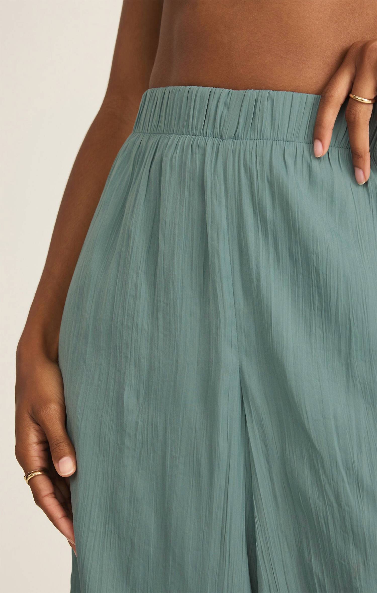 The trend report says boot-cut is in and that's exactly why we love this style. They are fit to perfection, flattering on any body type, and comfortable. They will be your go-to all season long. Elevate your beach look with the Sunset Satin Pant by Z Supply, a relaxed-fit piece crafted for warm-weather elegance in a stunning sea pine hue. Made from 100% Poly Satin, these high-rise, ankle-length pants feature a flared leg and an elastic waistband for a trendy yet comfortable fit. This fully lined design boasts a soft wash finish perfect for casual beach outings. Closure: Pull on. Inseam: 27.5".