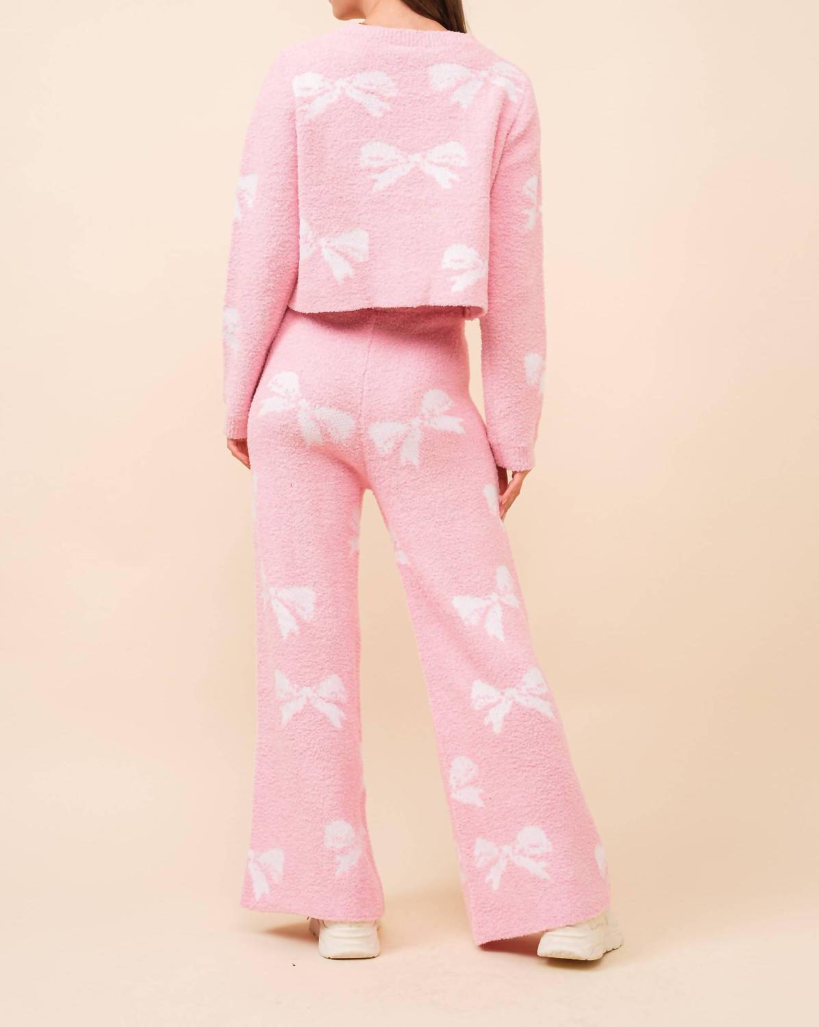 A set so cute you'll never want to take it off. Designed to look good while lounging, this little number is the perfect outfit for hanging at home in style. Slip into comfort with the Bow Print Cozy Sweater Set by Blue B, a must-have for your loungewear collection in a delightful baby pink tone. Designed with long sleeves and a charming graphic pattern, this set offers a crewneck style ideal for minimalist fashion lovers. Perfect for travel or everyday wear, it boasts a super soft blend fabric for an effortless feel. Care instructions recommend hand washing to maintain its cozy quality.