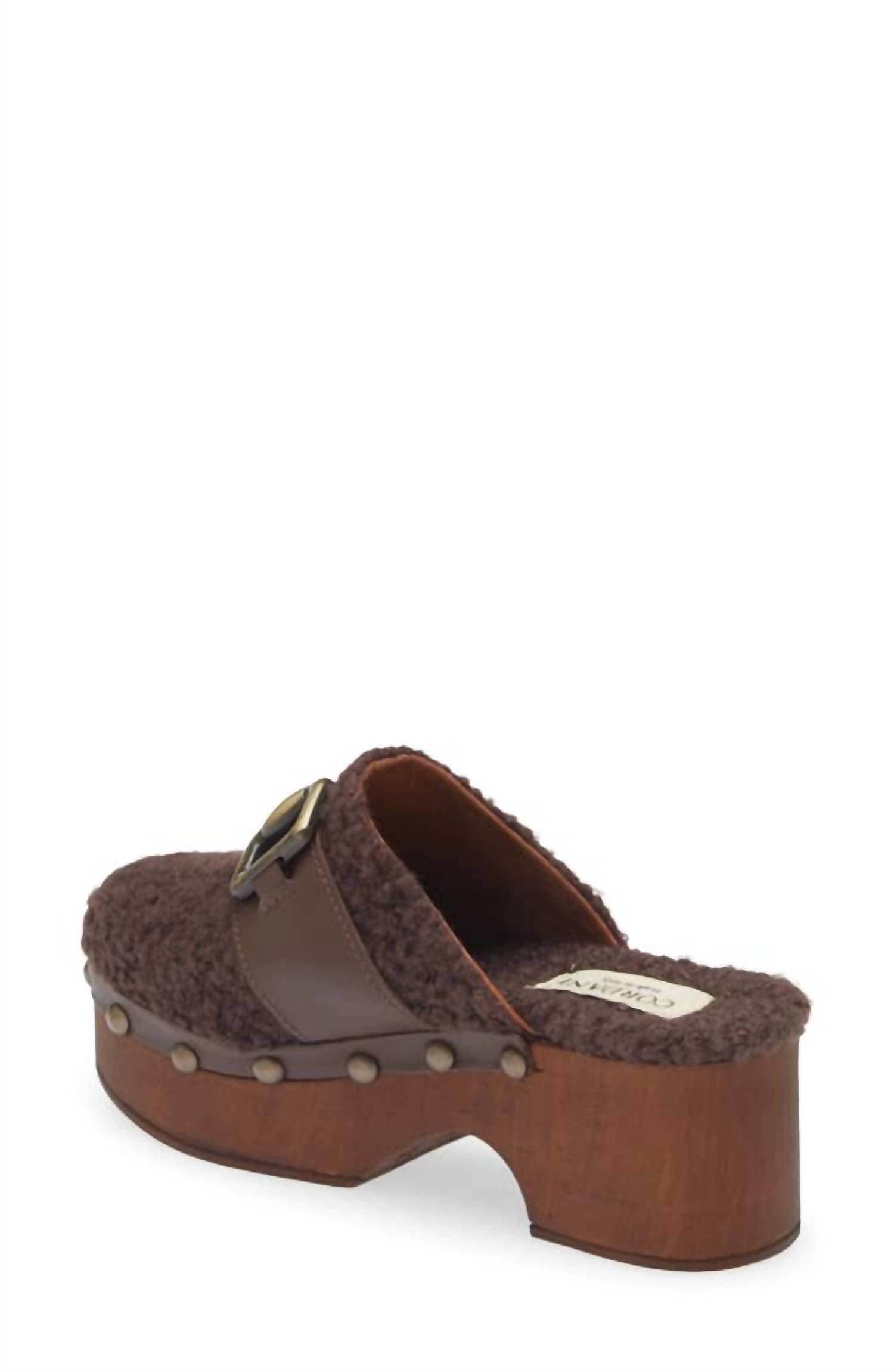 A trend that everyone is loving and this style might just be our favorite. The Winona Clog by CORDANI is a stylish footwear choice featuring faux shearling in a rich cacao shade, embellished with matching buckle and stud details on a wood-like platform. Crafted in Italy, this clog offers a comfortable fit with a lightly padded, leather-lined footbed supported by a durable rubber sole. It boasts a mid-height block heel of 2.75 inches and a platform height of 1.75 inches, finished with a classic round toe. Perfectly blending comfort and style, this piece is a sophisticated addition to any wardrobe.