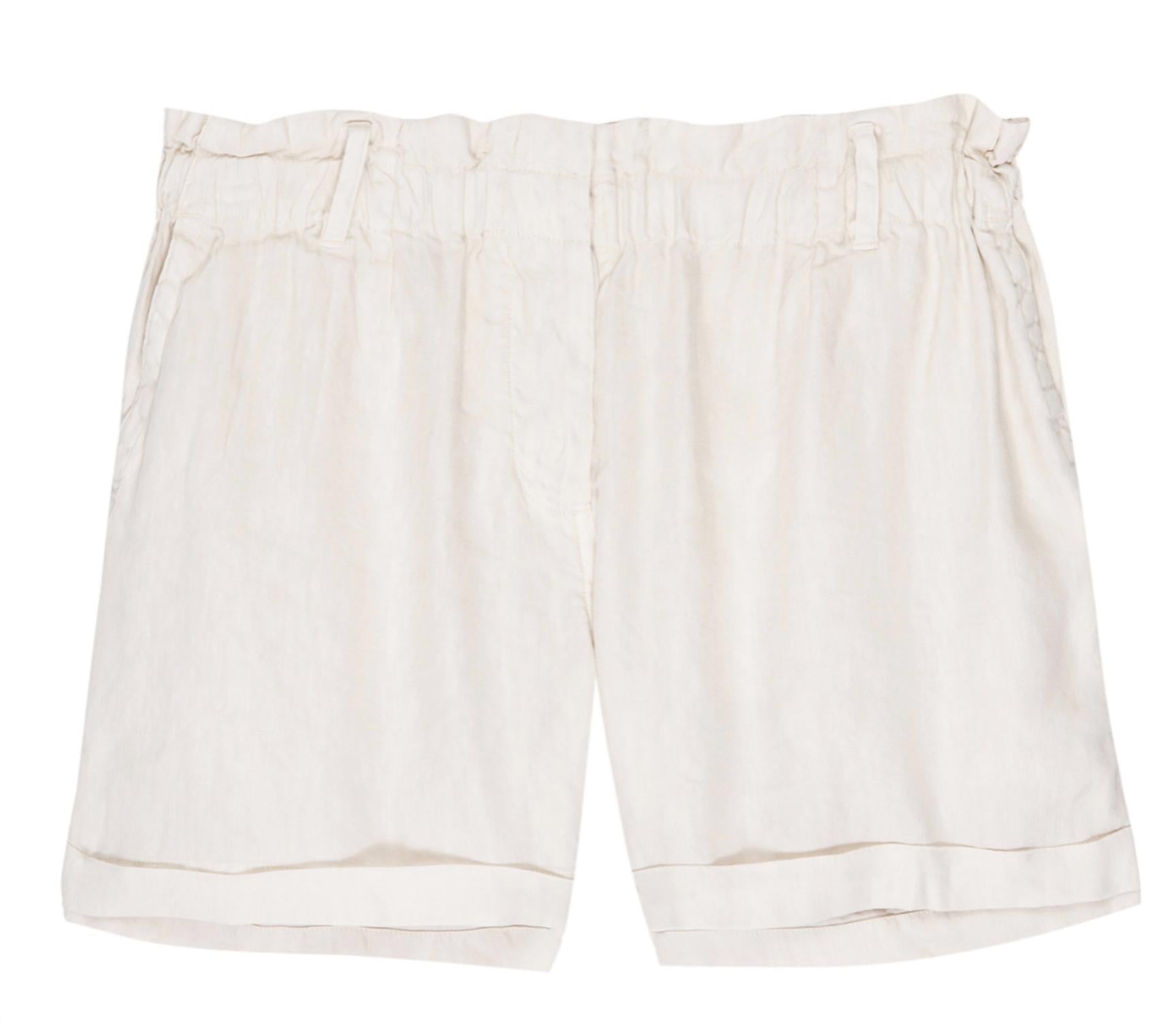 Vintage washed, lightweight, wide leg paperbag shorts featuring elastic waistband, 3-button fly with clasp and bar closure and side pockets. Machine wash cold. Outseam length measured from waistband edge: 13 1/2" (Measured from Small). Inseam length: 3 1/2"