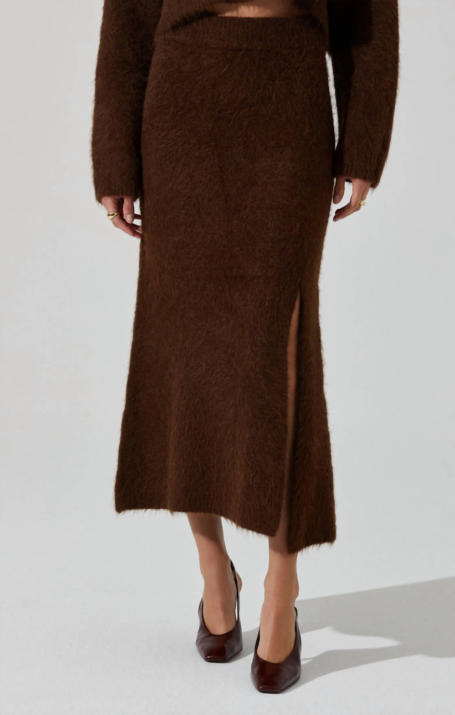 Show off just the right amount of skin in this beautifuly designed midi length skirt. Elevate your wardrobe with the Clarisse Midi Skirt by ASTR, crafted in espresso for a touch of effortless sophistication. This fuzzy knit A-line skirt features a versatile midi length, perfect for pairing with both boots and flats. Composition: 78% Alpaca, 19% Nylon, 3% Elastane. Closure: Pull on style. Care: Dry clean only. Ideal for creating a chic, cohesive look when paired with the Clarisse Sweater.