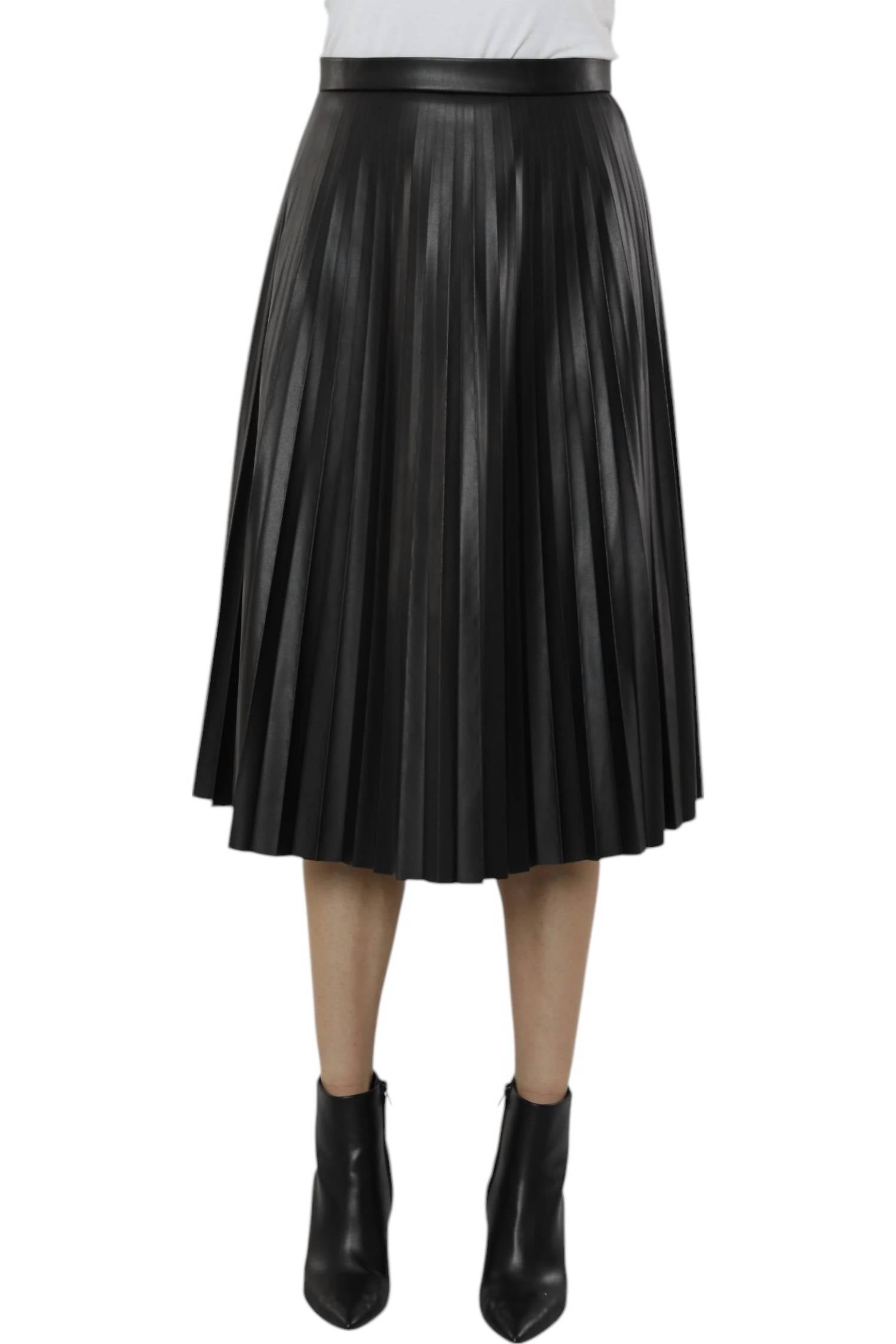 The midi length skirt is here to stay and we especially love this style. Exquisite blend of modern charm and classic elegance. Crafted from faux leather. Pleated A-line midi skirt flows gracefully. Featuring a side zipper closure for a sleek fit. Timeless silhouette transcends seasonal trends. Please dry clean to preserve its elegant simplicity.