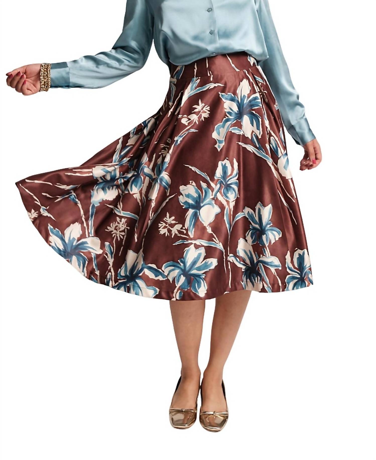 Introducing the Shelley Lucky Devil Poly Taffeta Skirt by Frances Valentine, a Spring standout in a rich mocha hue enhanced by a deep blue iris floral pattern. This full midi skirt features flattering box pleats and a convenient side button closure with a comfortable flat front and fitted elastic waistband that gathers at the back. Crafted from 100% polyester and made in India, it includes two side pockets for added practicality. Perfect for a Boho Chic vacation look, this skirt effortlessly combines elegance and style.