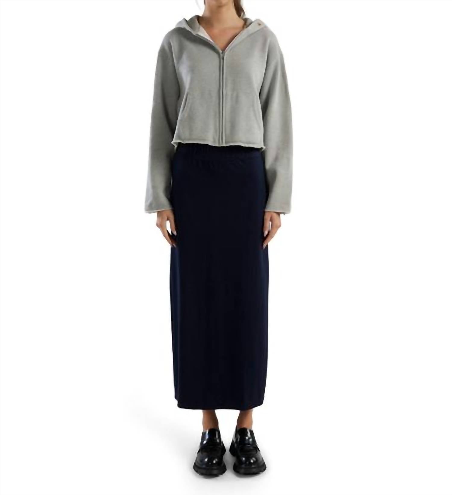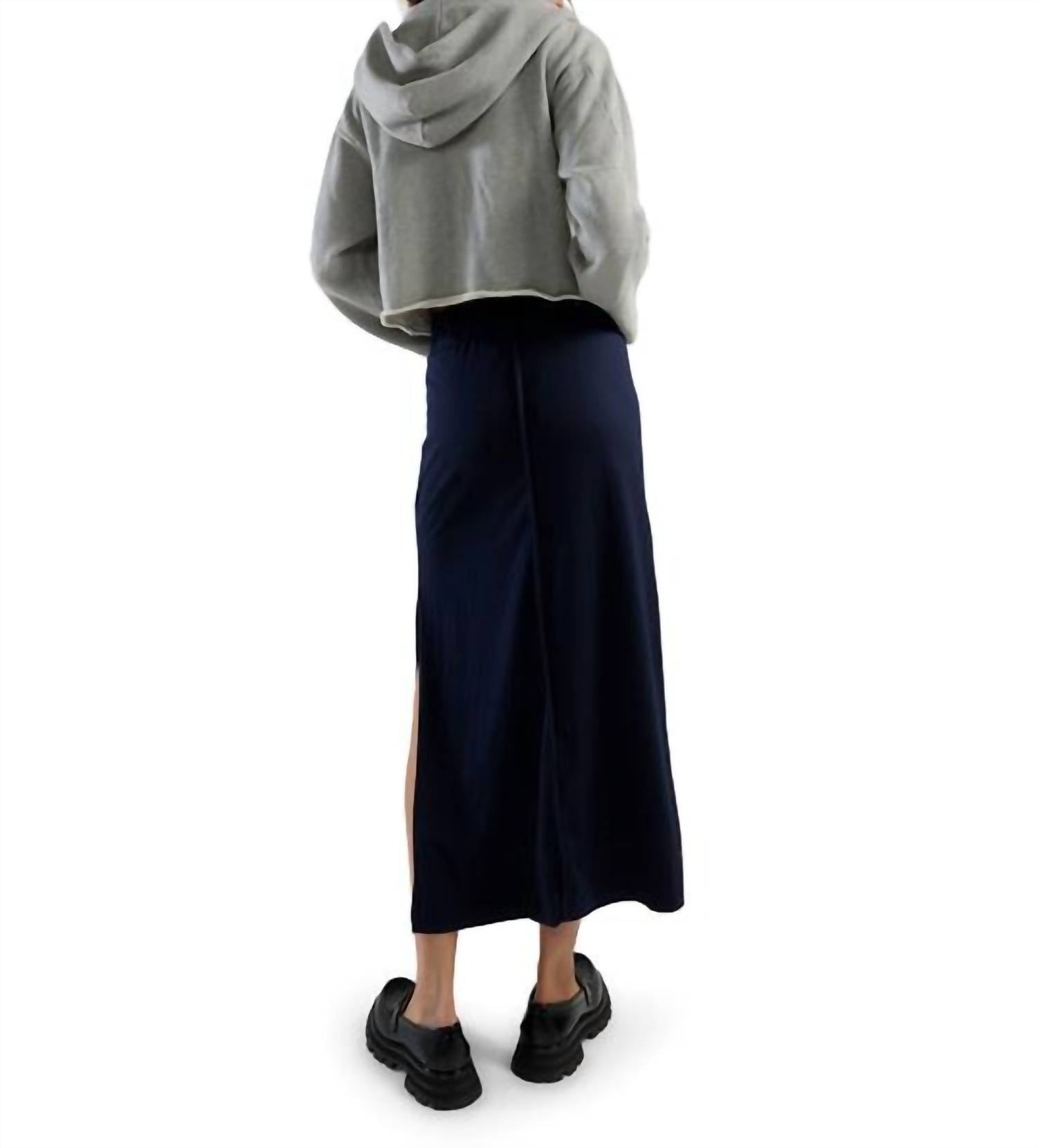 Who doesn't love a good maxi skirt? Introducing the Max Side Slit Maxi Skirt by LES TIEN, a stylish choice in classic navy perfect for minimalist trends this spring. Made in the USA with a lux jersey composition of 56% Supima, 38% Modal, and 6% Spandex, this skirt features a smooth texture, mid-rise, and sits comfortably above the ankle. It offers a modern touch with an exposed back French seam, elastic waistband, and side slits for added movement. Closure: Pull-on style. Care: Machine wash and tumble dry.