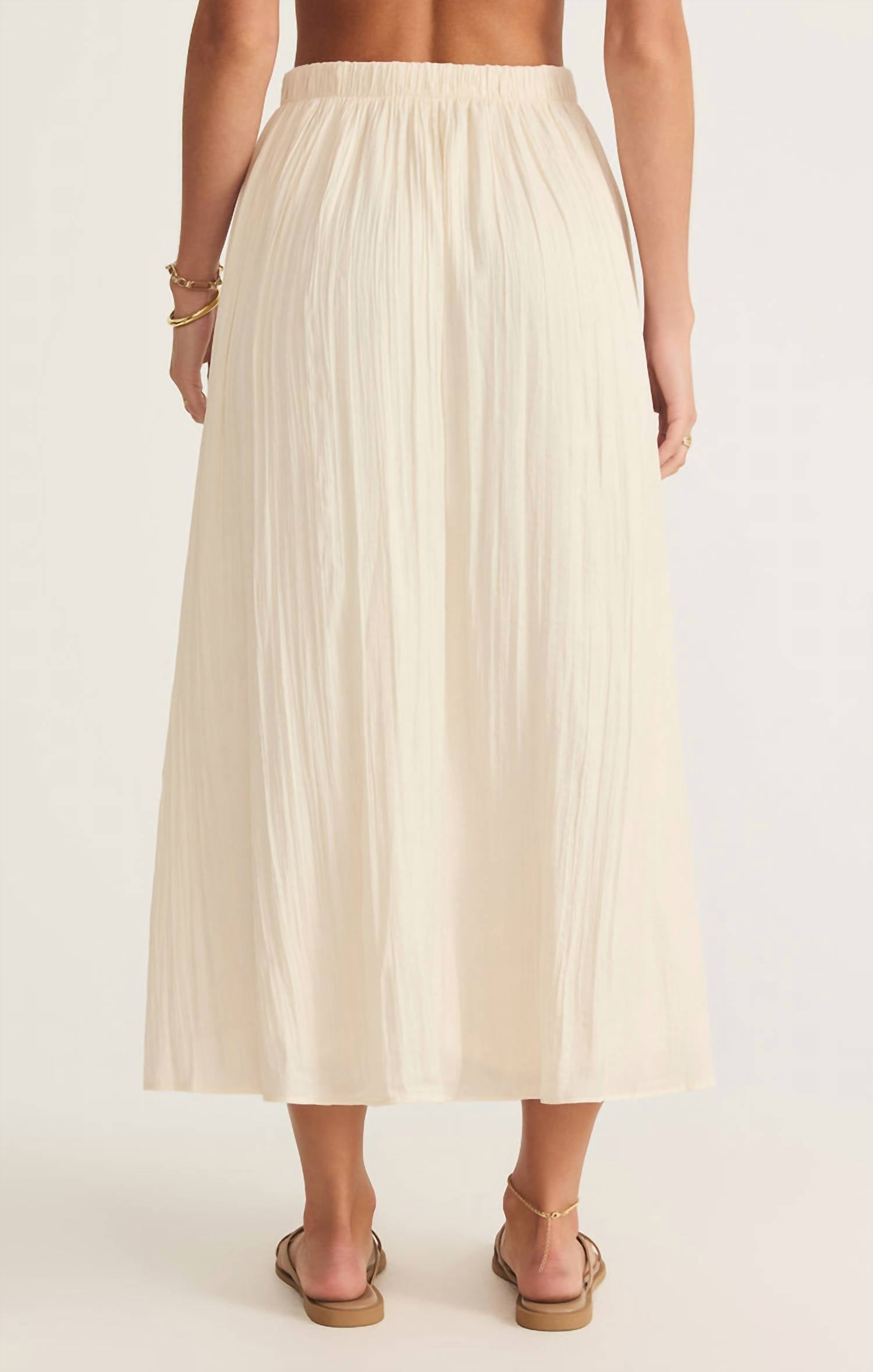 Tuck your favorite tee into this midi length skirt for an effortlessly cool look. Introducing the Nicoline Crinkle Midi Skirt by Z Supply, a timeless 90s-inspired piece perfect for your summer wardrobe. Crafted from 100% polyester, this textured skirt in sandstone features a fully lined interior and a comfortable elastic waistband with a pull-on closure. Its lightweight nature makes it ideal for a beach day or any casual outing. For optimal care, hand wash this stylish piece to maintain its softness and integrity.