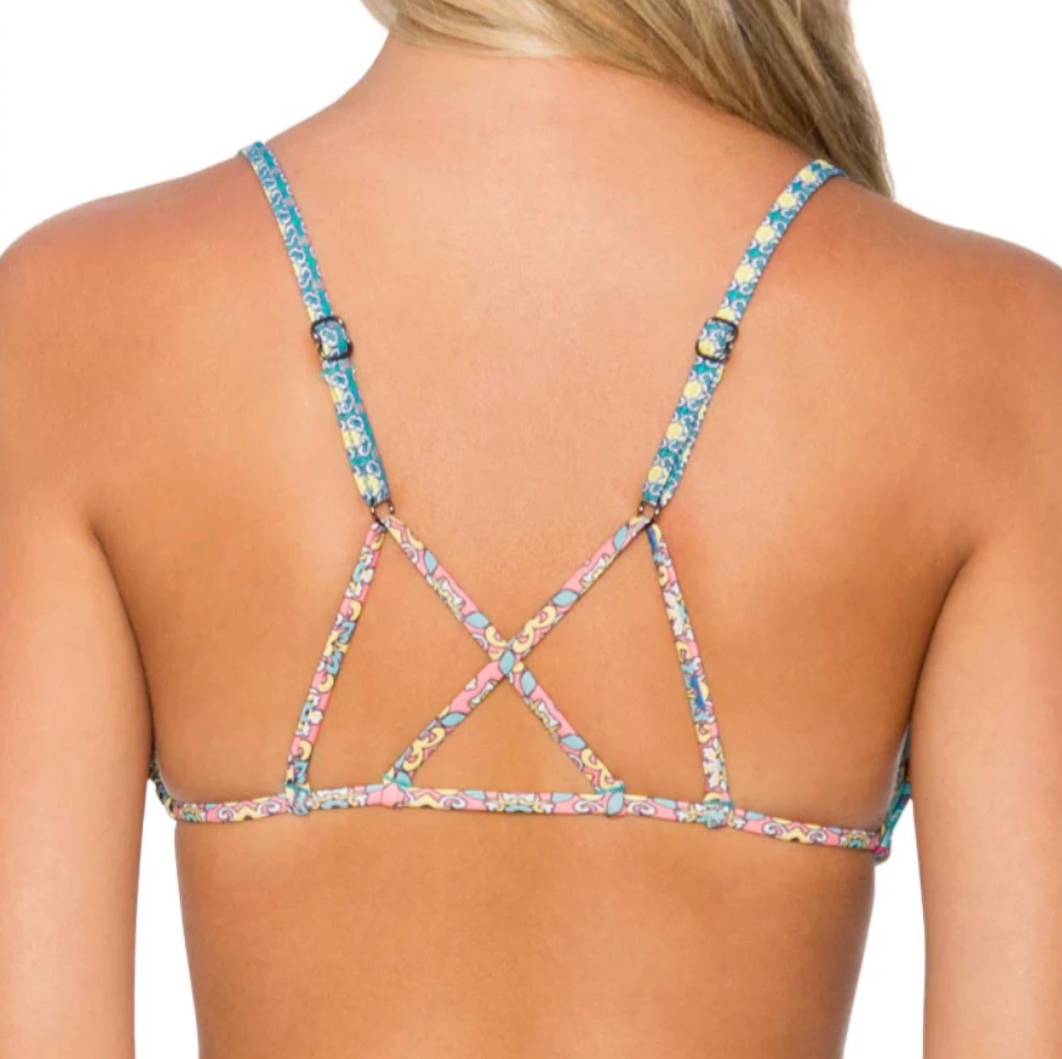 This cute and flattering swimsuit is perfect for making a splash at the pool, lounging on sun-kissed beaches, and staying stylish throughout the upcoming summer season. Embrace the boho chic trend with the Road Trip Triangle Swim Top by Swim Systems, perfect for poolside lounging or beach adventures. This patterned triangle bikini top in a vibrant Trinidad color features a stylish front tie and cross-over strapping detail at the back for a secure fit. Made from a durable nylon blend (82% Nylon, 18% Spandex), it ensures a comfortable experience. Care for this swimwear is easy with instructions to hand wash cold and lay flat to dry.