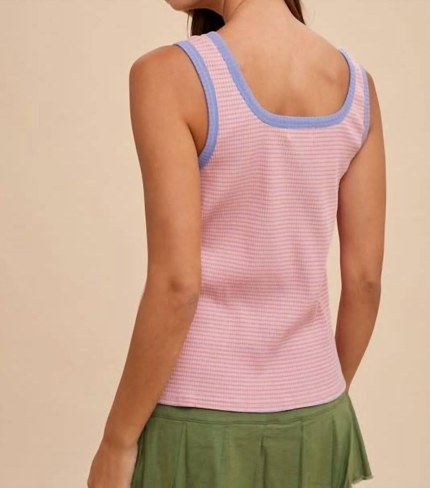 The perfect tank top for those warmer weather seasons. Discover effortless style with the Contrast Striped Rib Henley Tank by AnnieWear, a chic addition to any wardrobe in a light mauve hue. This sleeveless tank is crafted from a comfortable cotton blend, featuring a henley neck adorned with contrast binding for a striking look. With a relaxed fit and garment length of 23.5 inches, it promises both style and comfort. Closure is by button, making it versatile for various looks.