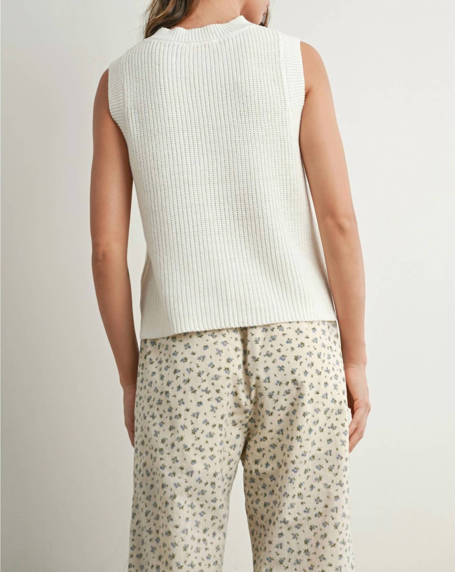Embrace effortless summer style with the Buttermelon Sleeveless Sweater Top in a chic ivory hue. This crewneck tank top is crafted from a 60% cotton and 40% acrylic blend for comfort, showcasing a stylish patterned design perfect for vacations or 4th of July gatherings. With its fashionable pull-on closure, the top is made with ease in mind. Care is simple: machine wash and line dry for best results.