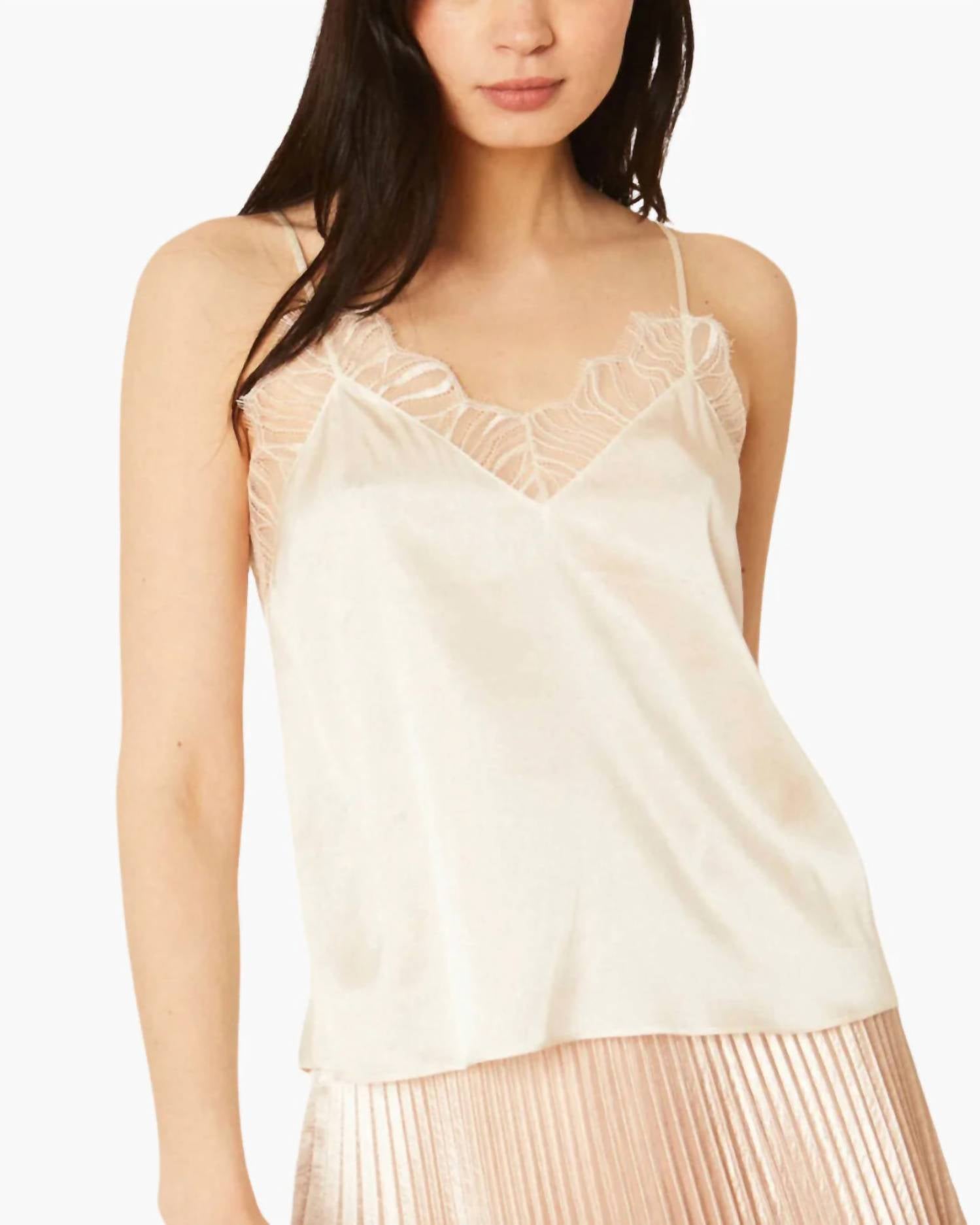 The perfect tank top for those warmer weather seasons. Introducing the Gia Tank by CABALLERO, a perfect summer piece in textured ivory silk that exudes elegance and charm. This women's tank top features delicate spaghetti straps, a v-neckline with exquisite lace detailing, and adjustable ties for a custom fit. Composition: 100% Silk, with a tie closure. Ideal for a chic evening out or a sophisticated work setting, making it a versatile addition to your wardrobe.