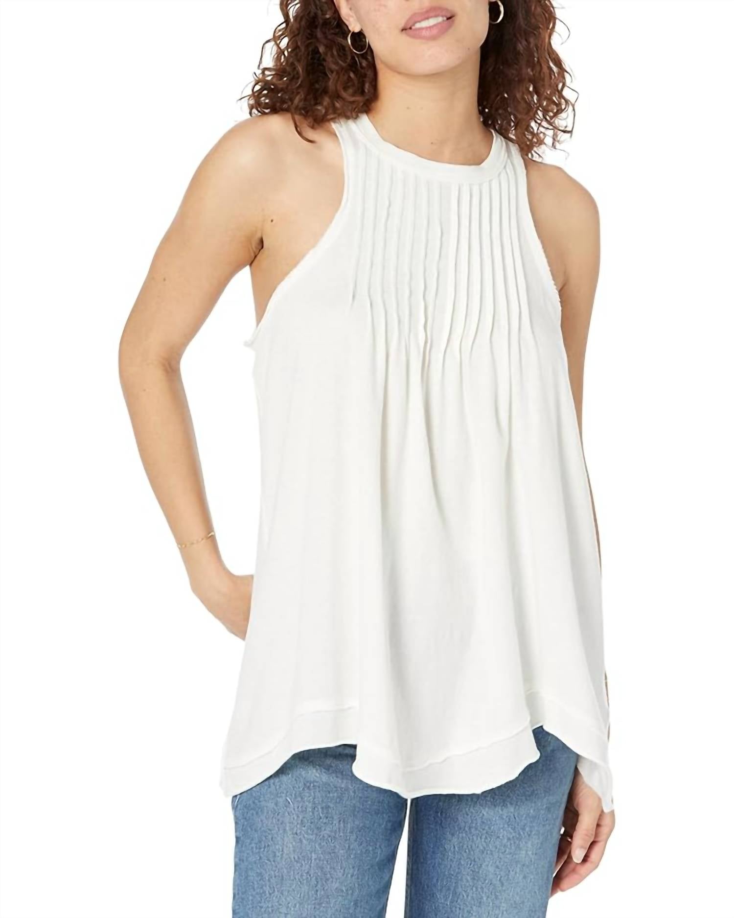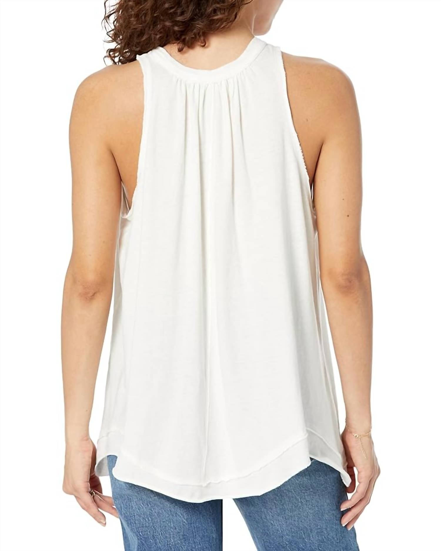 The perfect tank top for those warmer weather seasons. Relaxed, slouchy fit. High crew neckline. Sleeveless design with cutaway shoulders and dropped armholes. Tiered bottom hem with subtle distressing. Pullover style. Fabric: 100% Cotton. Hand wash, dry flat. Measurements on size Small - Length: 26 in. Chest Measurement: 15 in.