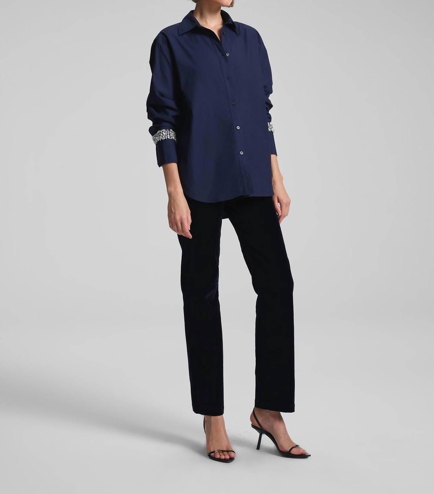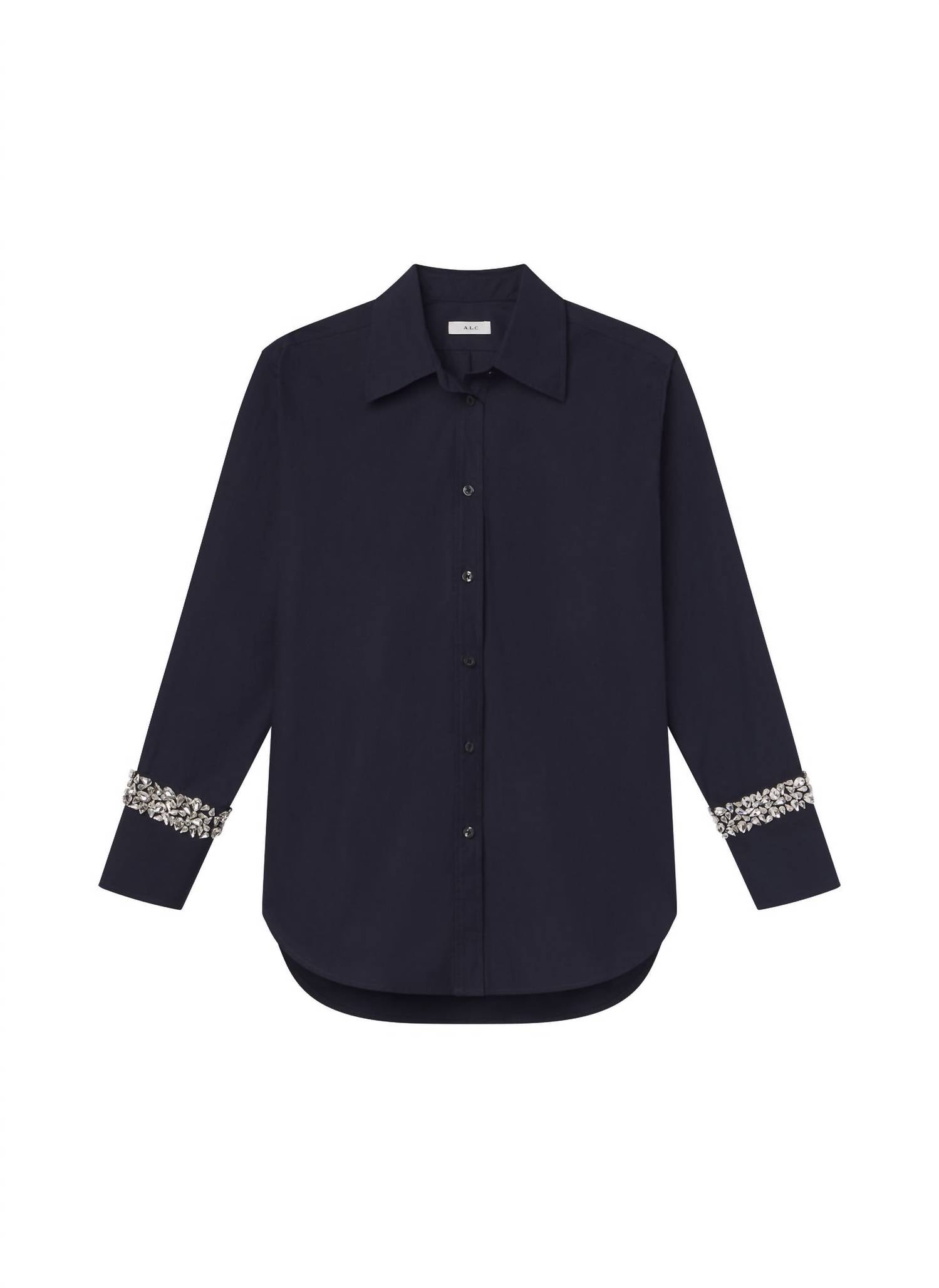 A classic button down shirt that will never go out of style. Elevate your wardrobe with the Calvin Crystal Embellished Long Sleeve Shirt by A.L.C., a sophisticated piece in rich maritime navy. Expertly crafted from 100% cotton poplin, this long sleeve shirt features hand-applied teardrop-shaped crystals on the cuffs, inspired by chandelier glass for a captivating shine. Designed with a classic button closure, this 29-inch shirt offers a tailored silhouette perfect for day-to-night transitions. For dry cleaning only, this exquisite shirt promises to be a statement piece for any dinner party. Model is 5'10" and wearing a size 4 (Bust: 31", Waist: 23", Hips: 34").