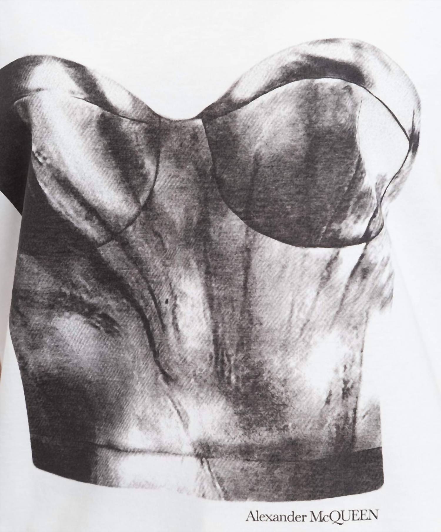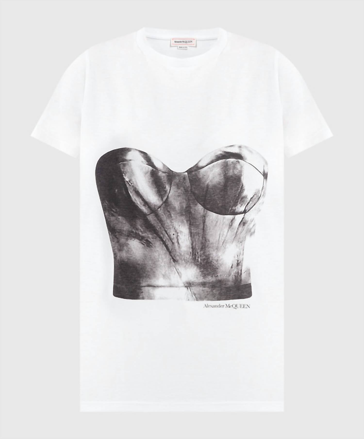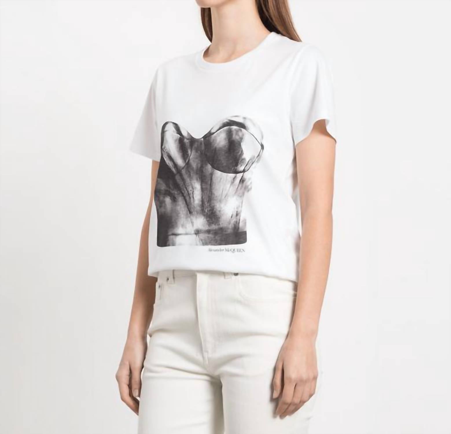 This classic, short sleeve tee will be your go-to staple this season and beyond. Introducing the T-shirt With Bustier Print by Alexander McQueen, a striking piece perfect for your holiday party wardrobe. This women's short sleeve tee, crafted from 100% cotton, showcases a bold graphic bustier and logo print in a chic white and black colorway. Made in Italy, it features a classic crewneck and a convenient pull-on style. For care, you can choose between hand or machine washing. The model is 176 cm tall and wears a size 40.
