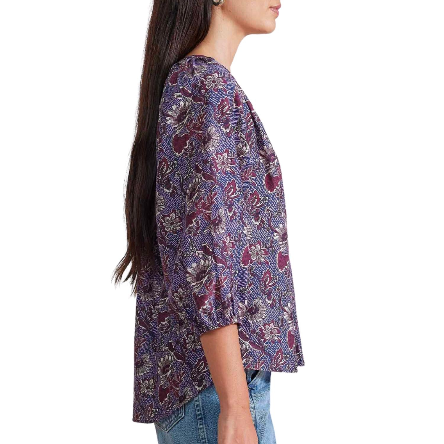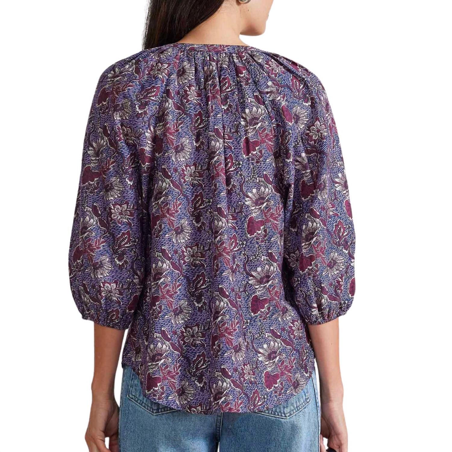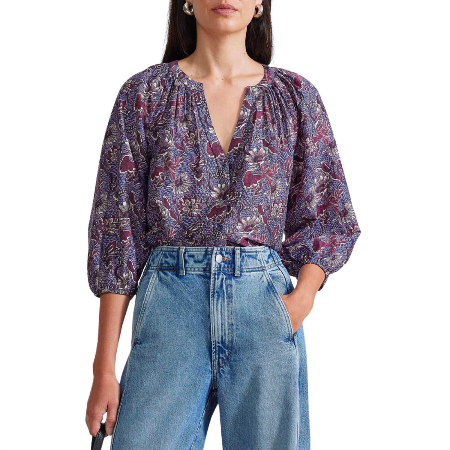Pair this with your favorite jeans and slides for your next girls night out. Featuring subtle puff sleeves with elastic cuffs, a button front closure, and an open V-neckline with gathers at the banded collar for an elevated, feminine style. Fabric: Cotton, Silk. Dry clean. True to size.