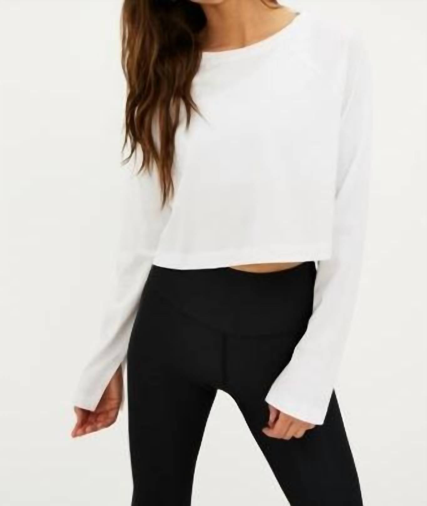 A long sleeve top you can wear with denim, skirts, well... just about anything! The June Round Neck Long Sleeve Top by Beach Riot is the ideal travel companion for those who appreciate minimalist and versatile style. Made from a soft cotton/modal jersey blend, this white top features a cropped silhouette with long drop-shoulder sleeves and a classic crew neckline. Composition: 60% Cotton, 40% Modal. Closure: Pull-on. Care: Machine wash, tumble dry.