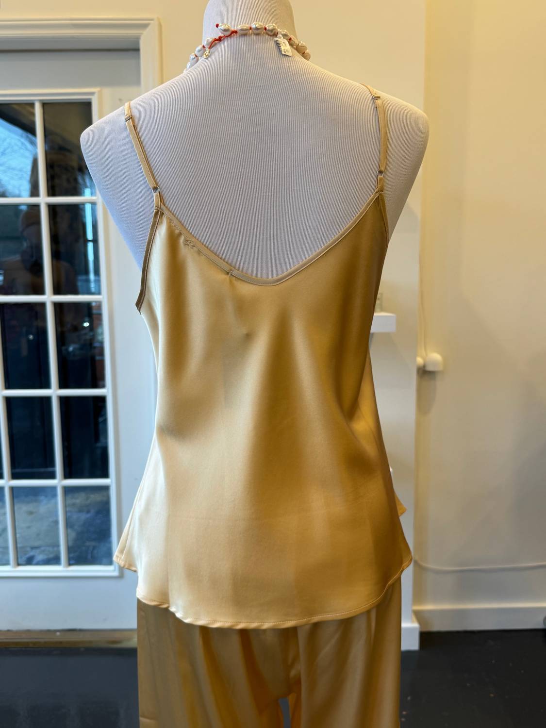 Throw this on with your favorite blazer for a more polished look. Introducing the Silk Charmeuse Cami Top by Brazeau Tricot, a sophisticated piece in an elegant sand hue. With spaghetti straps and a V-neckline, this camisole is ideal for any occasion, offering both comfort and a touch of luxury. Made from the finest silk, it's designed in a solid pattern with a pull-on closure, perfect for a minimalist wardrobe for those spring vacations. Care instructions: Hand wash and tumble dry.