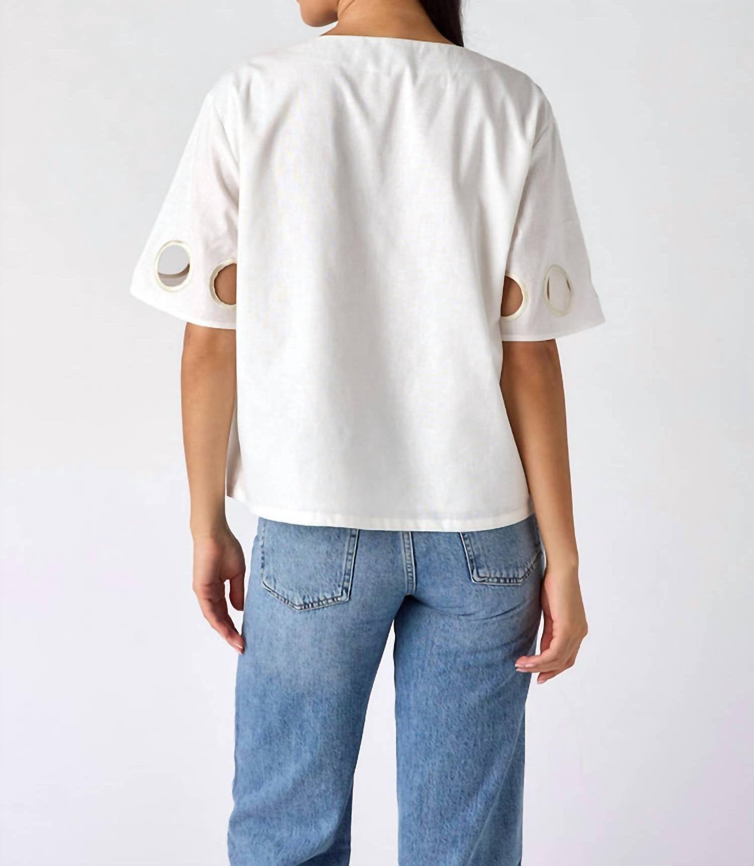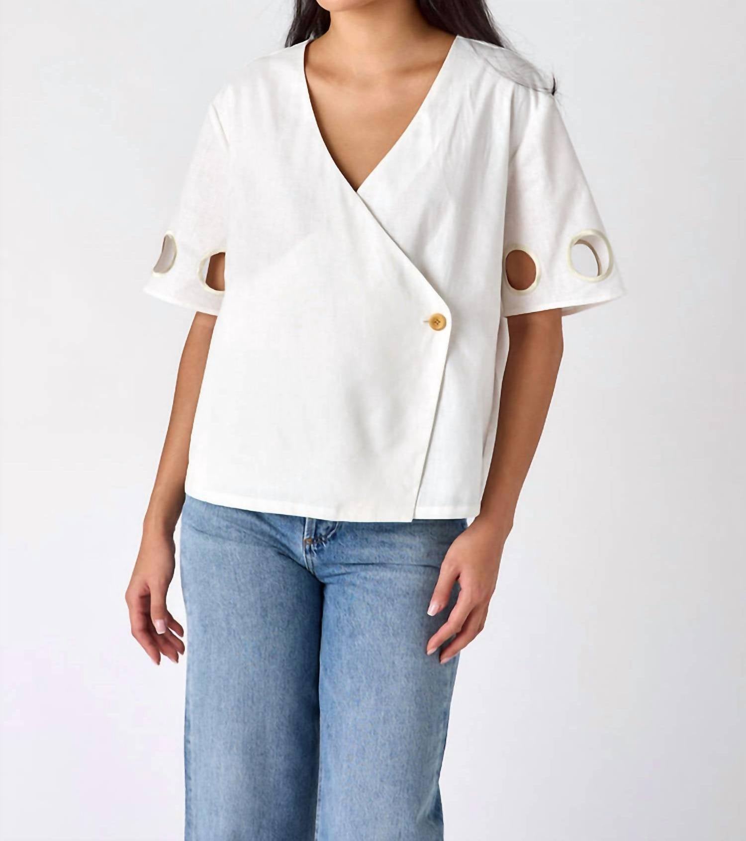 A timeless blouse that will never go out of style. Introducing the Coen Top by Crosby by Mollie Burch, a chic addition to your spring wardrobe. This hip-length blouse in white features short sleeves and a flattering V-neckline with a hidden snap for added security. Crafted from a mediumweight linen and cotton blend, it offers durability with a smooth handfeel and elegant drape. Closure: Kimono-style button closure. Care: Dry clean only. Length: 24.5 inches (size small).