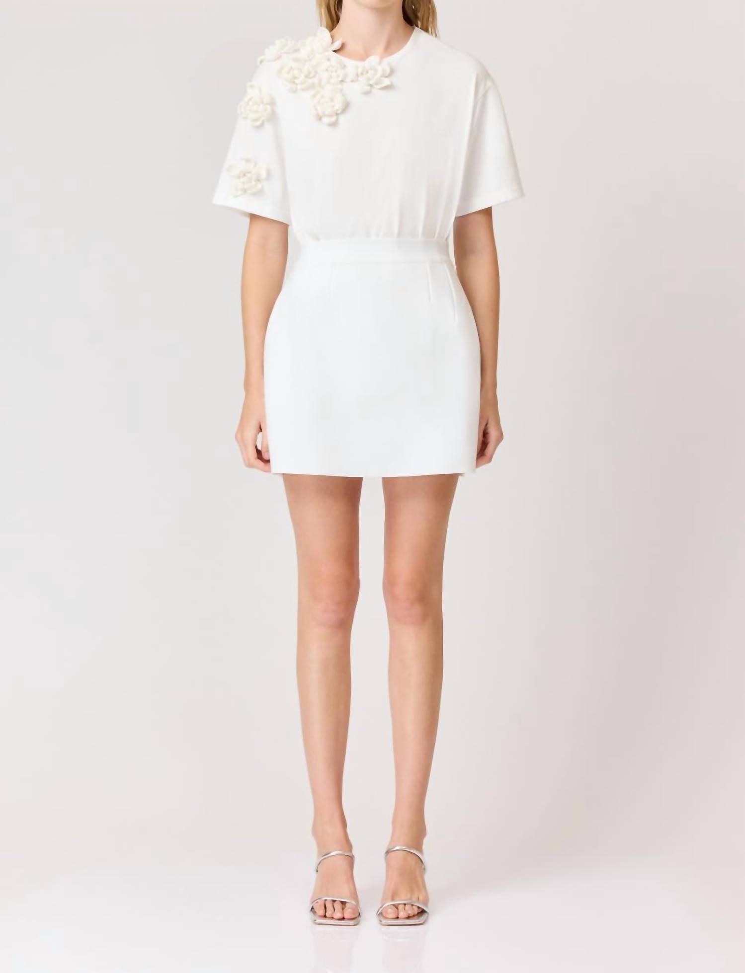 The short sleeve tee you'll want in every color. Introducing the Azzuro Jersey Crochet T-shirt by Curaae, a stunning addition to your spring wardrobe in classic white. This textured tee features short sleeves and intricate crochet rosettes adorning the crewneck. Crafted from a cotton/polyester blend with 100% cotton rosettes, it effortlessly combines comfort and style for any cocktail party occasion. Please note that this garment lacks specific care instructions.