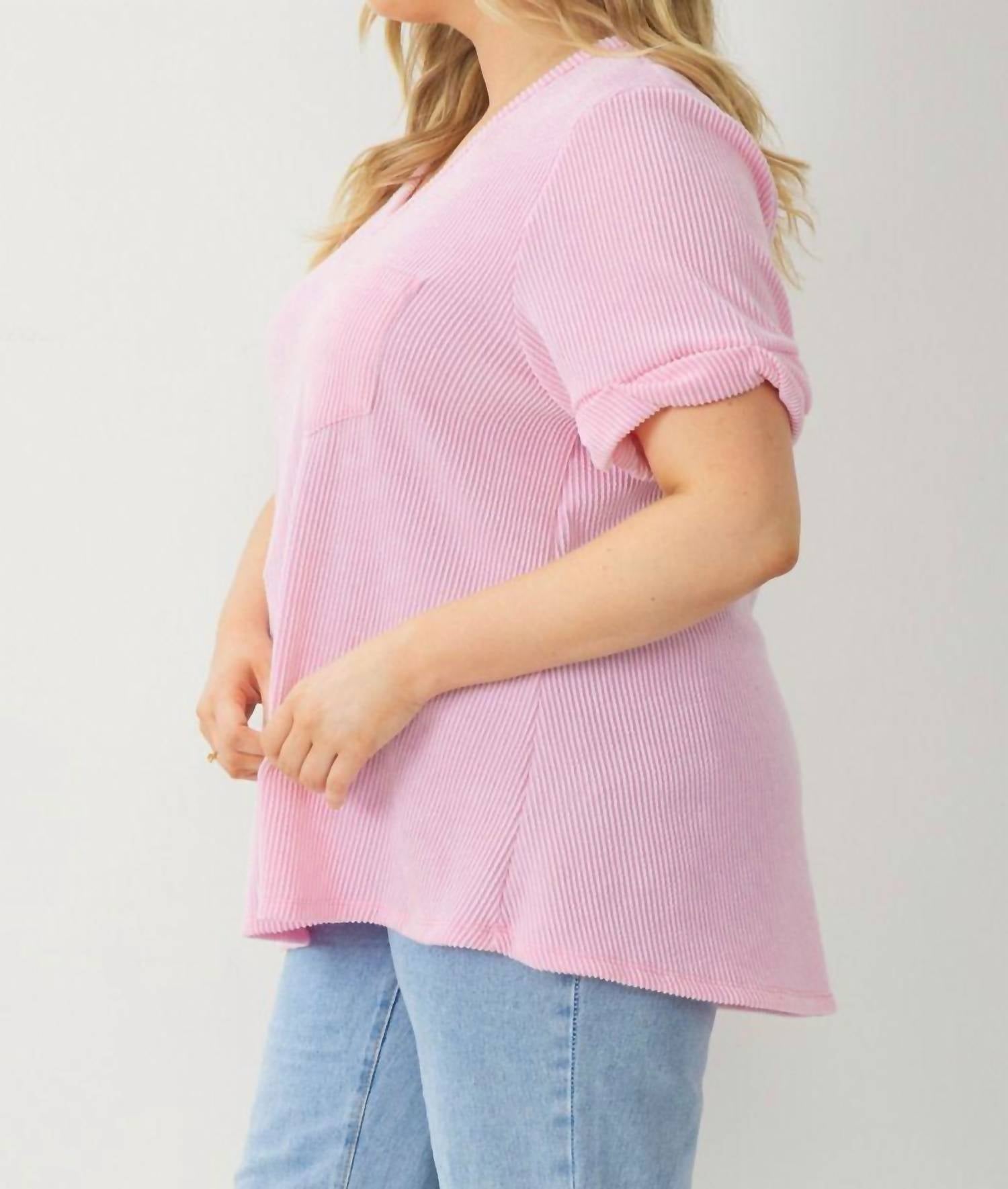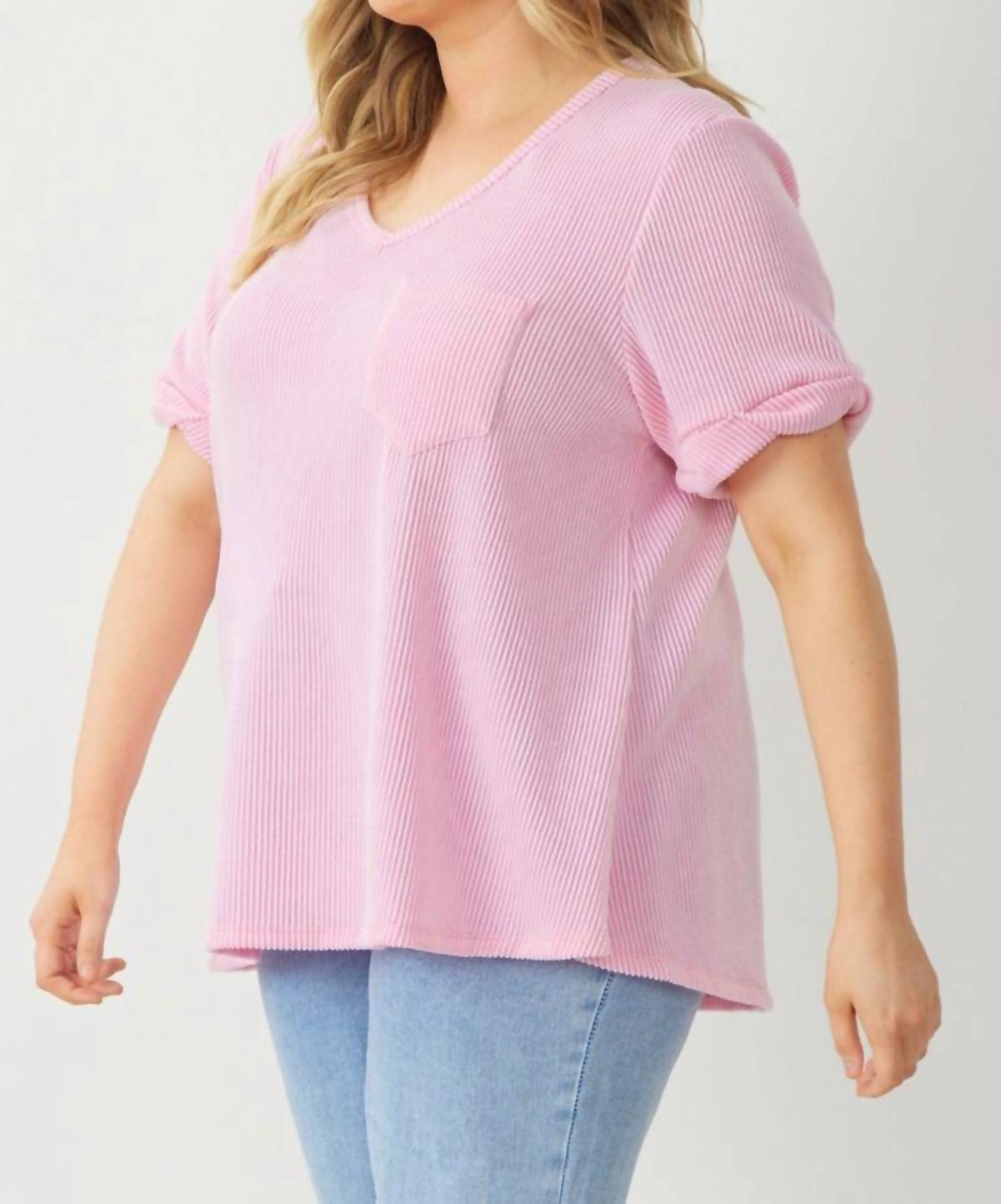 Look no further, you just found your perfect tee!This Relaxed Fit Tee Is So Comfortable You Will Want To Live In It Year Round. The Soft Pink Color Is Perfect For Transitioning To Spring. Tee Has A V-Neckline With Short Sleeves Featuring Twisted Rolled Cuffs And Pocket At Bust. Tee Is Unlined, Non-Sheer And Lightweight. Grab Your Shorts Or Jeans And You Are Set To Go. 76% Polyester, 21% Rayon, 3% Spandex. Model Is 5'9" And Wearing A Size Extra Large.
