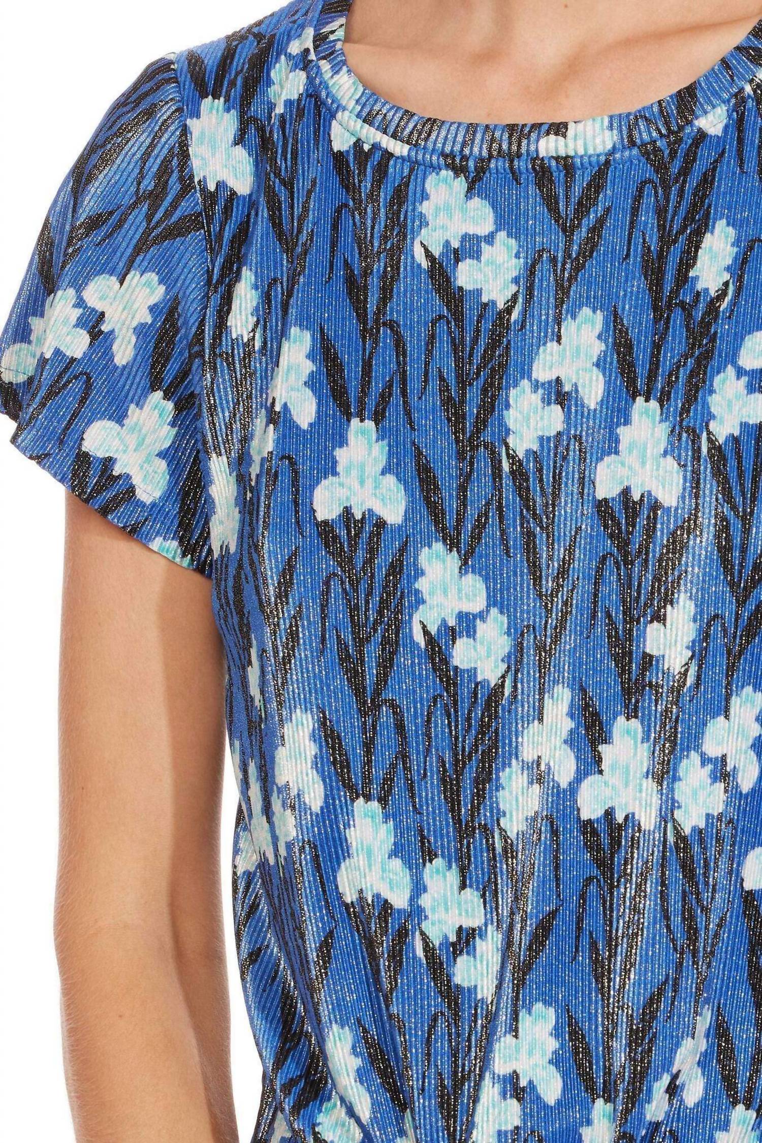 A timeless blouse that will never go out of style. Elevate your wardrobe with the Griffin T-shirt by EVA FRANCO, a chic take on the classic t-shirt in enchanting Blue Iris. This floral-patterned blouse features short sleeves, a round neckline, and elegant pleated details, finished with a charming self-tie at the waist. Made from 100% Polyester, its pullover styling promises effortless wear. Perfect for holiday parties, this piece embodies a boho chic trend.