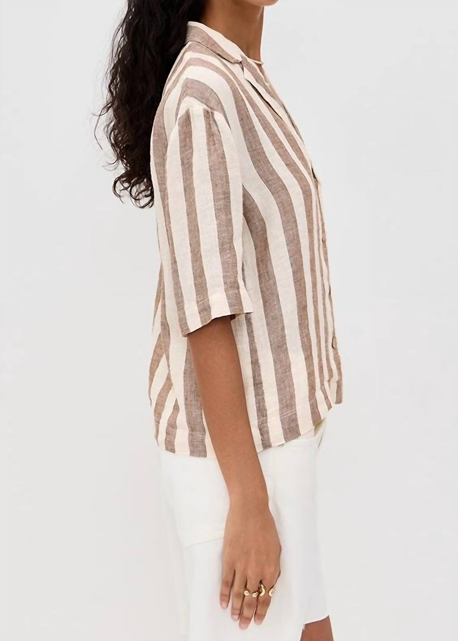 Perfectly tailored and soft to the touch. Elevate your summer wardrobe with the Palma Linen Camp Shirt in Cocoa Beach Stripe from Faherty, perfect for a minimalist vacation vibe. Featuring short sleeves and a collared neck, this piece ensures style with comfort in a lightweight, non-stretch linen weave. Crafted from 100% linen, it boasts a button closure and is imported from China, measuring 23.25 inches from shoulder in size XS. For maintenance, simply machine wash cold.