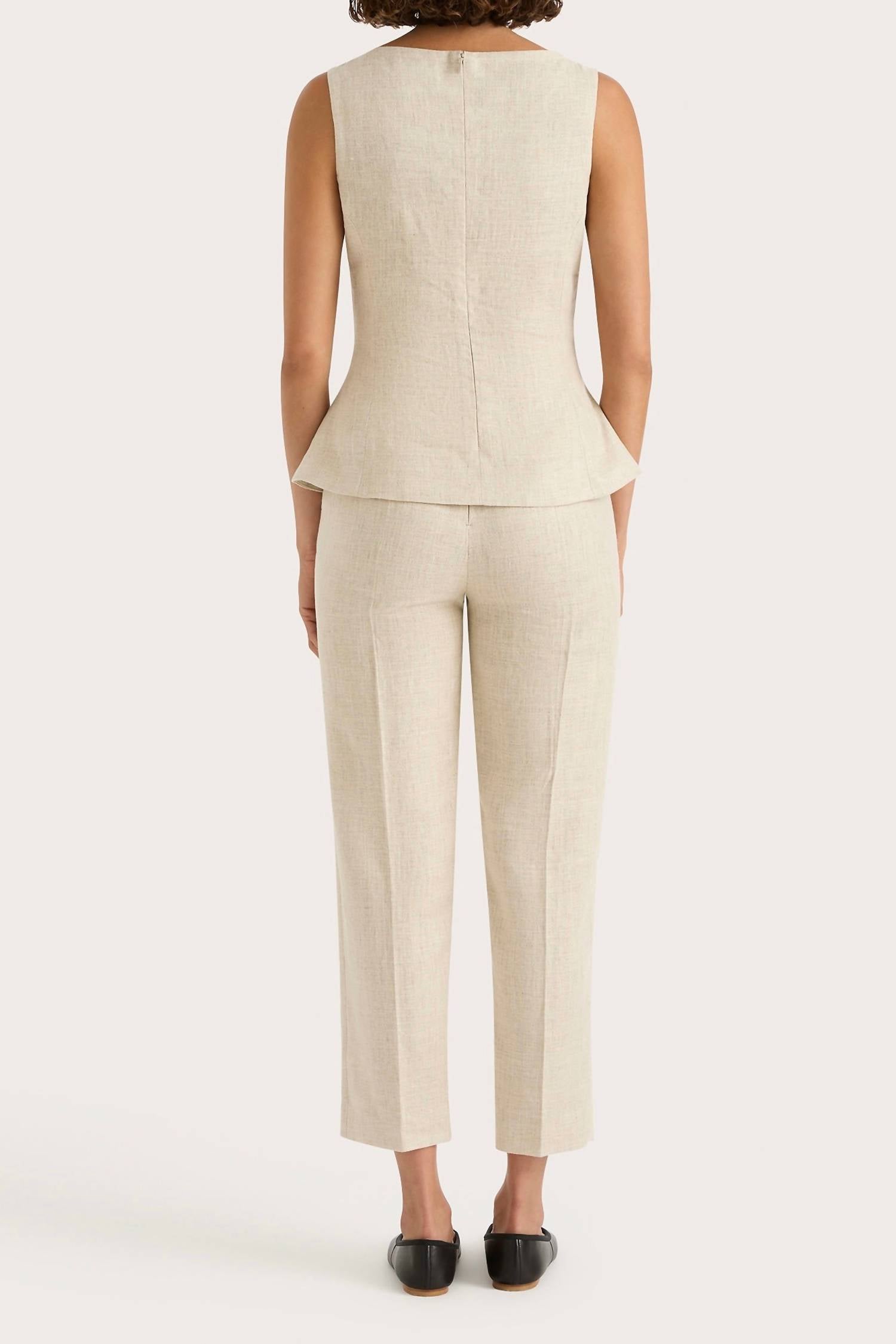 Meet the Ana Boat Neck Top by FAITHFULL THE BRAND, a chic addition crafted for the preppy style enthusiast. This sleeveless blouse is made from a luxurious 100% European Flax linen, originating from Indonesia. It features a flattering boat neckline and a peplum-style hem that cinches at the waist, providing a feminine silhouette. Easy to care for, simply hand wash and line dry. Ideal for a vacation wardrobe in classic white, complete with a convenient zip closure.