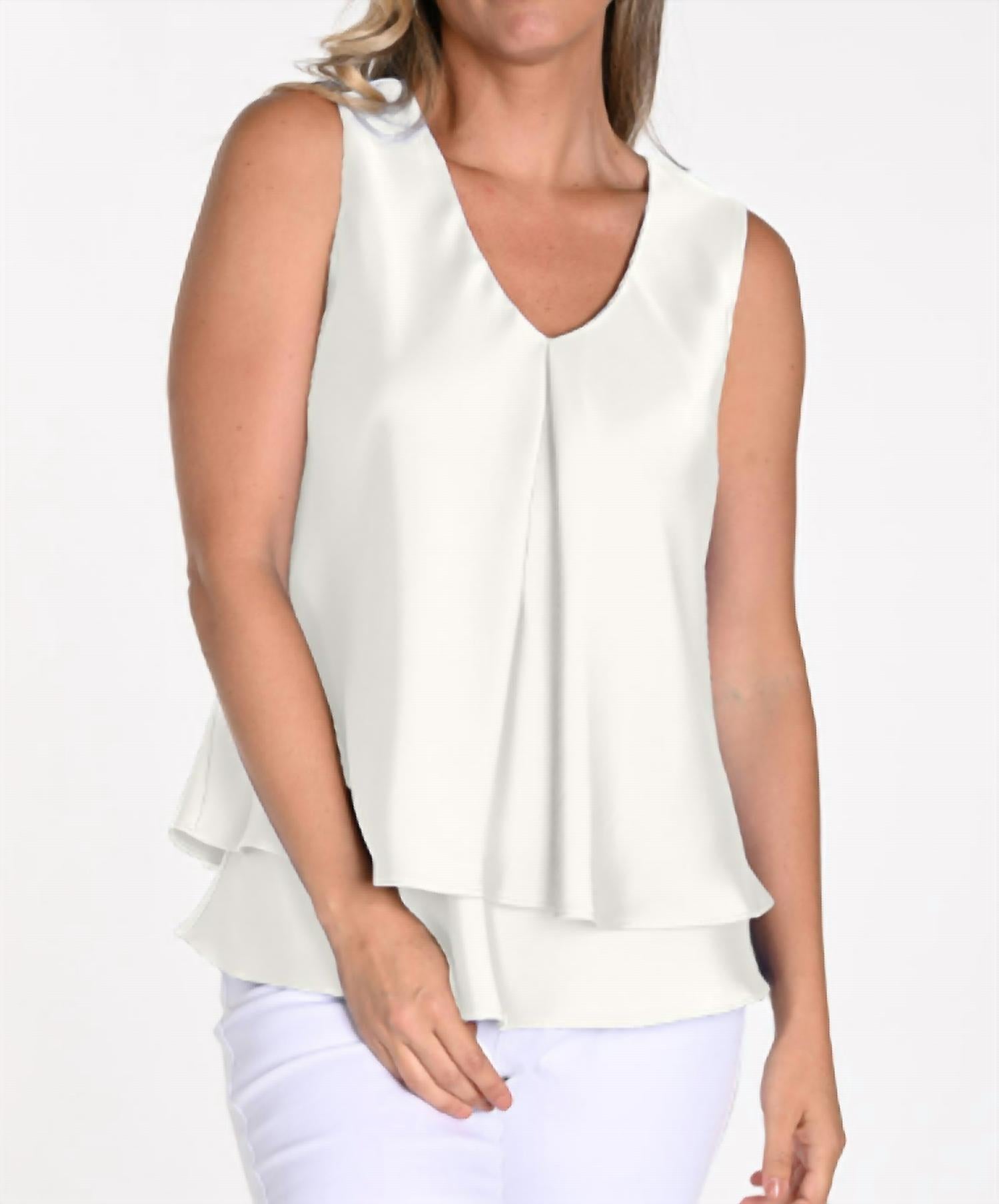 Pair this with your favorite jeans and slides for your next girls night out. Experience elegance with the Frank Lyman Layered Satin Sleeveless Blouse in a timeless ivory hue. Crafted from a lightweight satin blend, this blouse showcases a chic V-neck and an eye-catching layered hem. Its sleeveless design makes it perfect for layering or wearing on its own. Composition: 100% Polyester, offering both style and comfort.