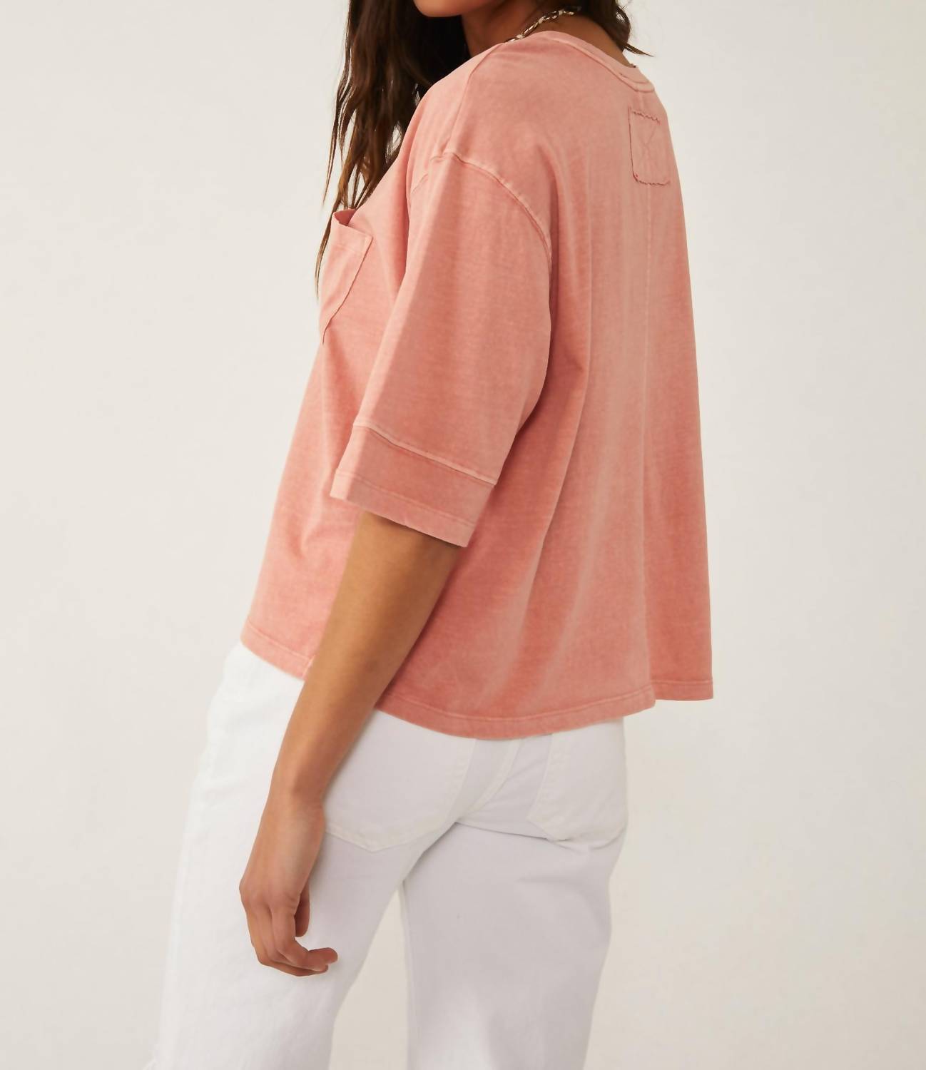 The short sleeve tee you'll want in every color. Introducing the Alissa Tee by Free People in a charming Rose Blush hue, perfect for elevating your wardrobe essentials. This short sleeve tee is crafted from cotton and features a scoop neckline and a relaxed, boxy fit with dropped shoulders for that vintage-inspired appeal. With a convenient front patch pocket and subtle distressing at the hemlines, the tee embodies a true lived-in look. It's a pull-on style made for effortless wear, measuring 22.25 inches in length with a 46-inch bust and a sleeve length of 10 inches. Care: Machine wash cold.