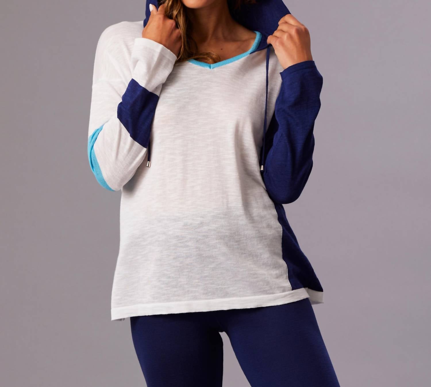 The French Kyss V-Neck Long Sleeve Hoodie is a stylish women's piece that combines comfort and contemporary fashion, ideal for a spring dinner party. This long sleeve hoodie is crafted from a cotton and acrylic blend that hits at the hip, offering a patterned design in a white/multi colorway. Featuring a convenient pull-on closure and a practical V-neck with a hooded neckline, it adds a minimalist touch to your wardrobe. This item is imported and should be cared for with a delicate hand wash or dry cleaning.