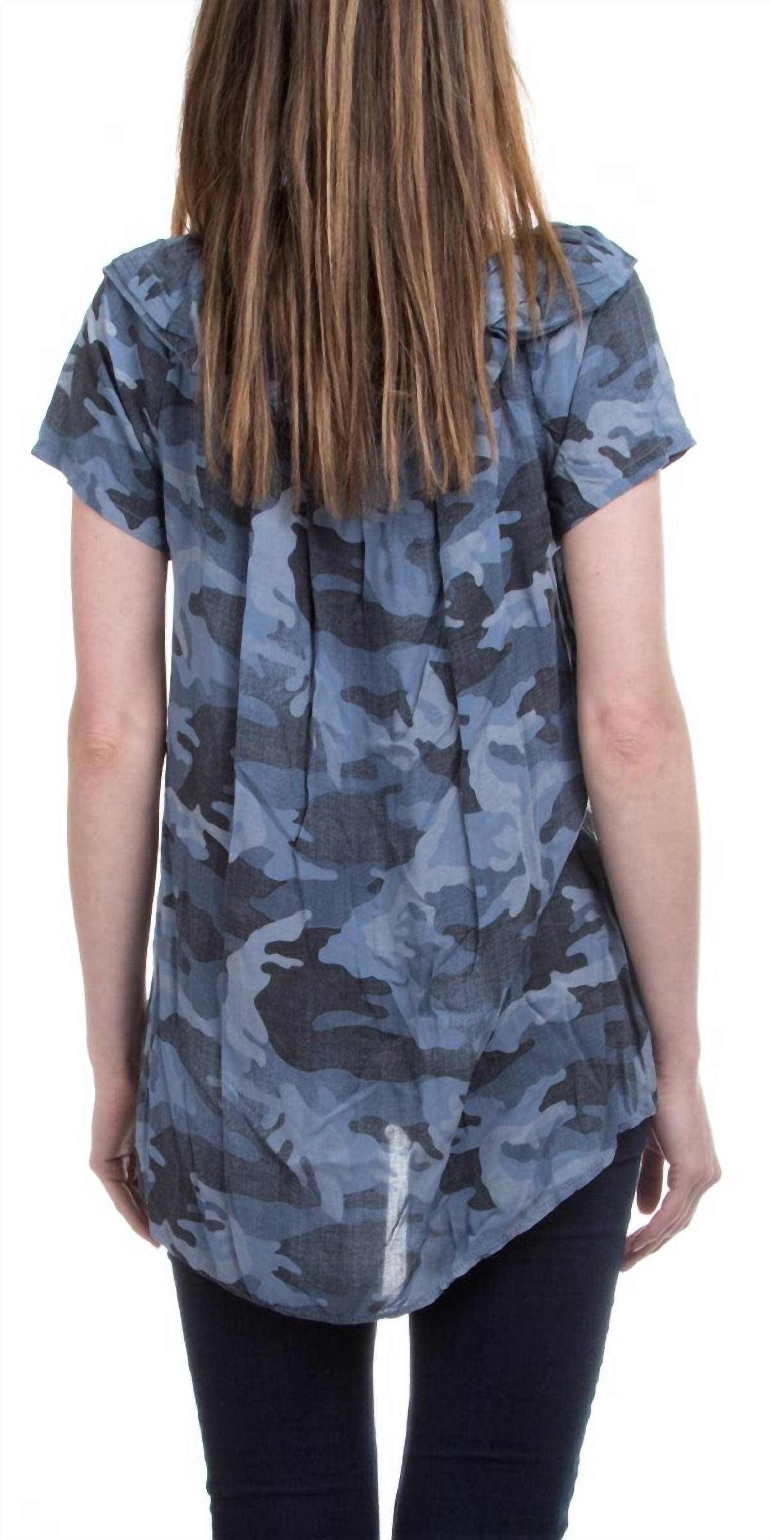 A timeless blouse that will never go out of style. Introducing the Alba Camo Top by GIGI MODA, a stunning piece in blue camouflage perfect for versatile styling. With short sleeves and a distinctive ruffle design, this top features an elastic scoop neckline that can be worn on or off the shoulder, accented by a charming front tie. Crafted from 100% Viscose and made in Italy, it offers a luxurious feel. Closure type: Pull On. Care instructions: Hand wash and line dry. This top comes in one size, making it a seamless addition to any wardrobe.