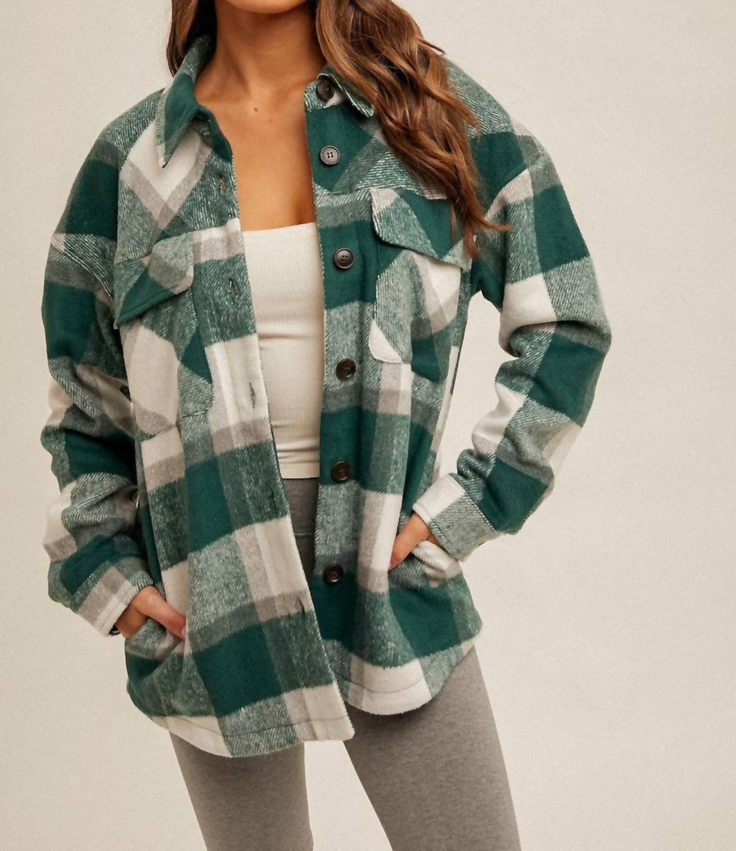Perfectly tailored and soft to the touch. Plush addition to your fall wardrobe. Crafted from 100% polyester, perfect for layering on those travel escapades. Forest green plaid & check pattern adds a touch of streetwear flair, complete with functional pockets and a classic collared neckline. Easy to care for with hand wash instructions. Seamlessly blends comfort with style.