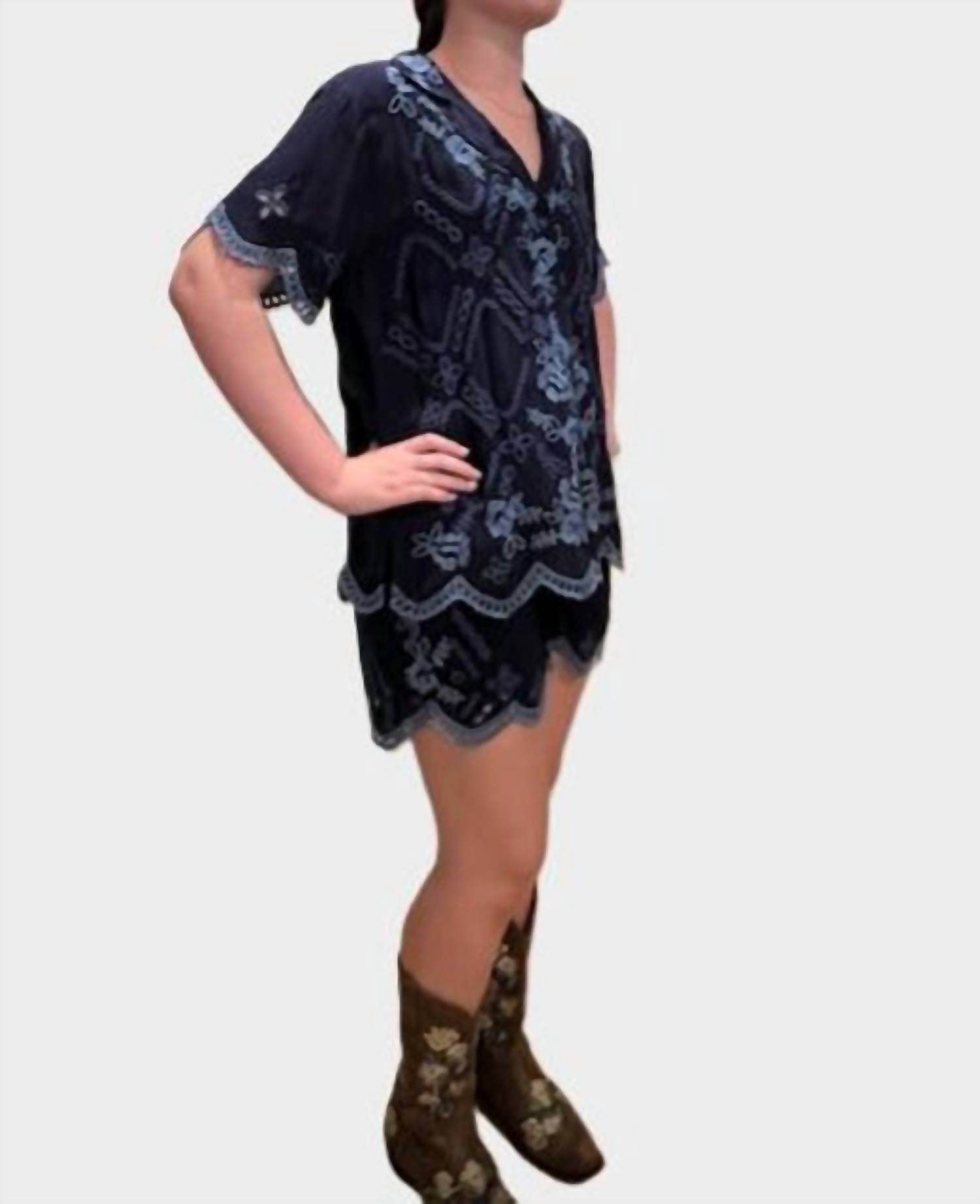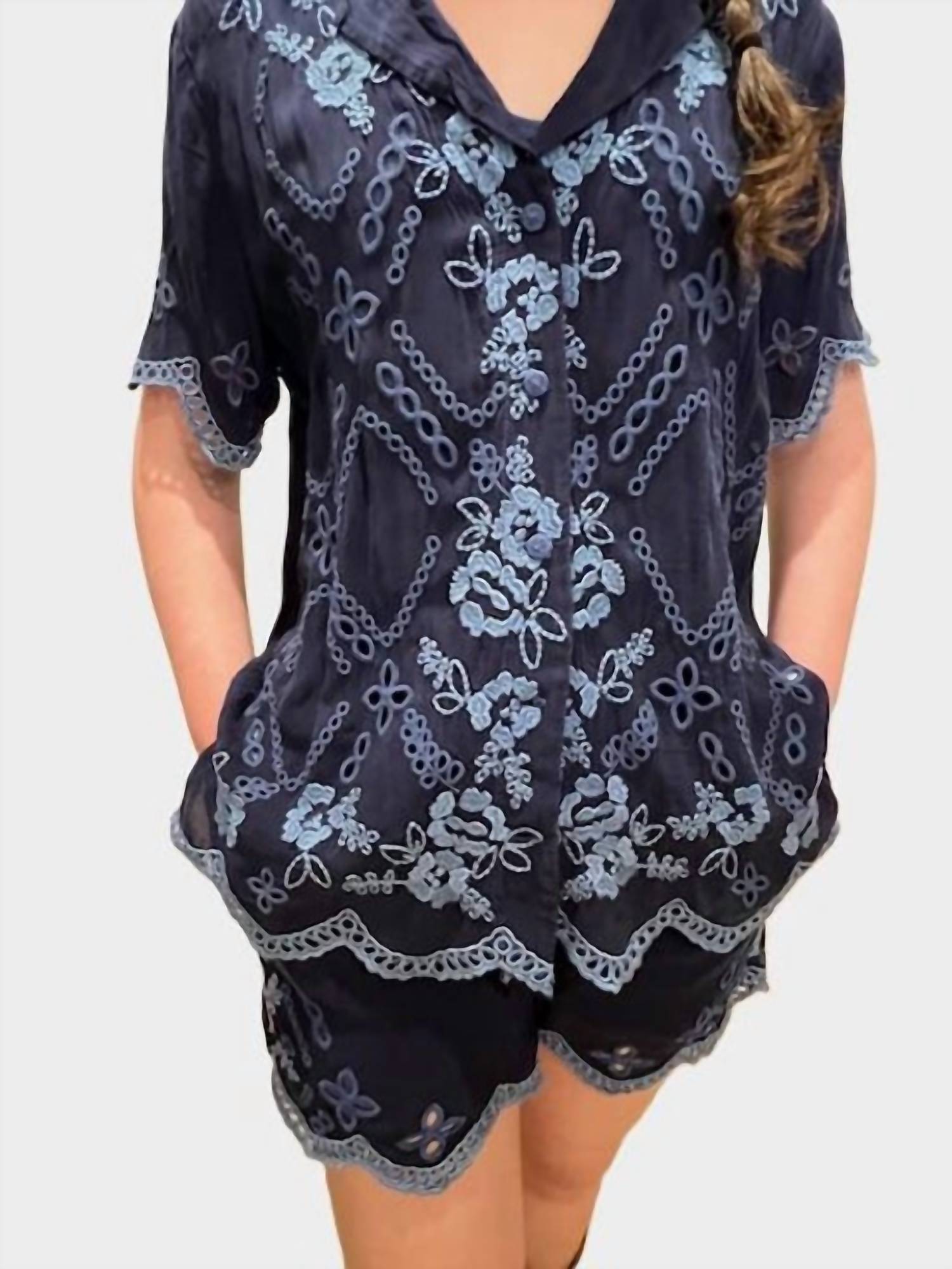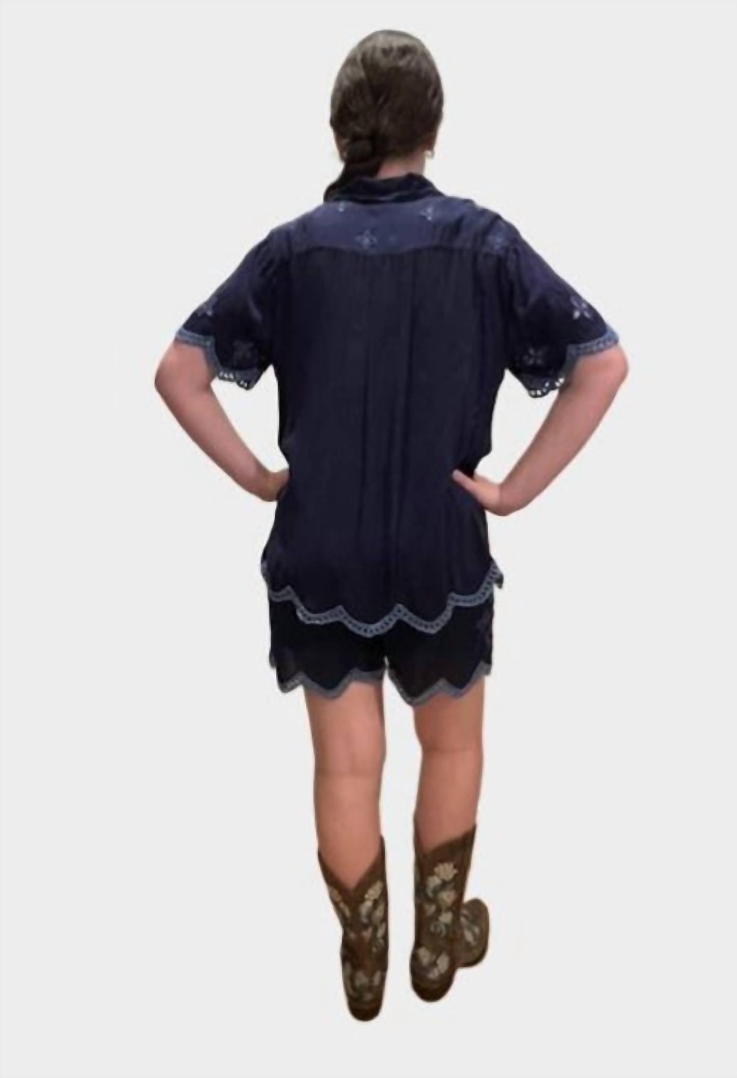 A versatile blouse that works from desk to dinner! Adorned with all-over embroidery and crafted with a classic collared button front, the 'Chryssie Camp Shirt in Santi' from Johnny Was features a drop shoulder, side slits for a relaxed fit, and a delicate scalloped hem. Pair with the 'Tempest Shorts in Santi' for an ideal match and elevated resort look. Machine Wash. Model is 5'4" and wearing a size Small.