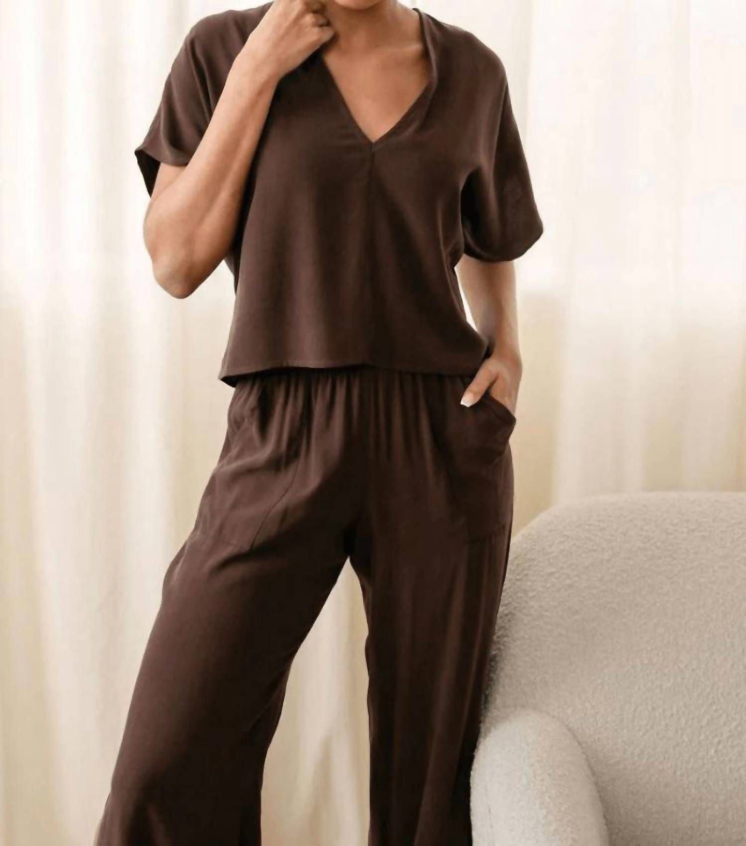 The short sleeve tee you'll want in every color. Discover the Easy T Box Top by Natalie Busby, a minimalist staple in a rich Espresso hue, crafted for women who appreciate effortless elegance. This tee features short sleeves, a V-neckline, and a chic, cropped fit, perfect for showing off your favorite pair of pants. Made from a luxurious blend of 63% Tencel and 37% Viscose, it offers comfort and a touch of sophistication, originating from Nashville, TN. The pull-on style simplifies your dressing routine, while the care instructions recommend machine wash in delicate cold and line drying, ensuring lasting quality.