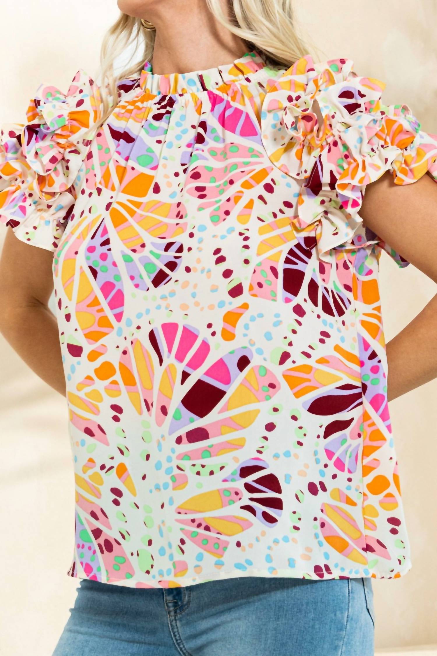A versatile blouse that works from desk to dinner! Embrace effortless style with the Nothing Left To Say Blouse by Oddi, a vibrant multi-color top perfect for vacation vibes. This patterned blouse showcases short ruffle sleeves, a charming cowl neck, and a relaxed fit. Crafted from 100% polyester, it features a button and keyhole back closure for added flair. A playful and carefree addition to your wardrobe, designed for those leisurely days.