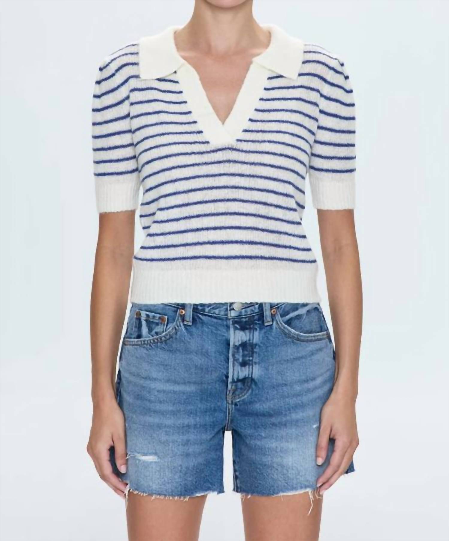 Introducing the Billie Pleat Sleeve Polo Shirt by PISTOLA, a chic addition to any spring wardrobe with short sleeves and a classic collared neckline. Made from a blend of 45% Acrylic, 30% Nylon, 15% Wool, and 10% Mohair, it offers a lightweight and breathable feel. This slightly cropped top, finished with maritime shell stripes, is crafted in China and features a pull-on closure. For best results, dry clean this stylish piece.