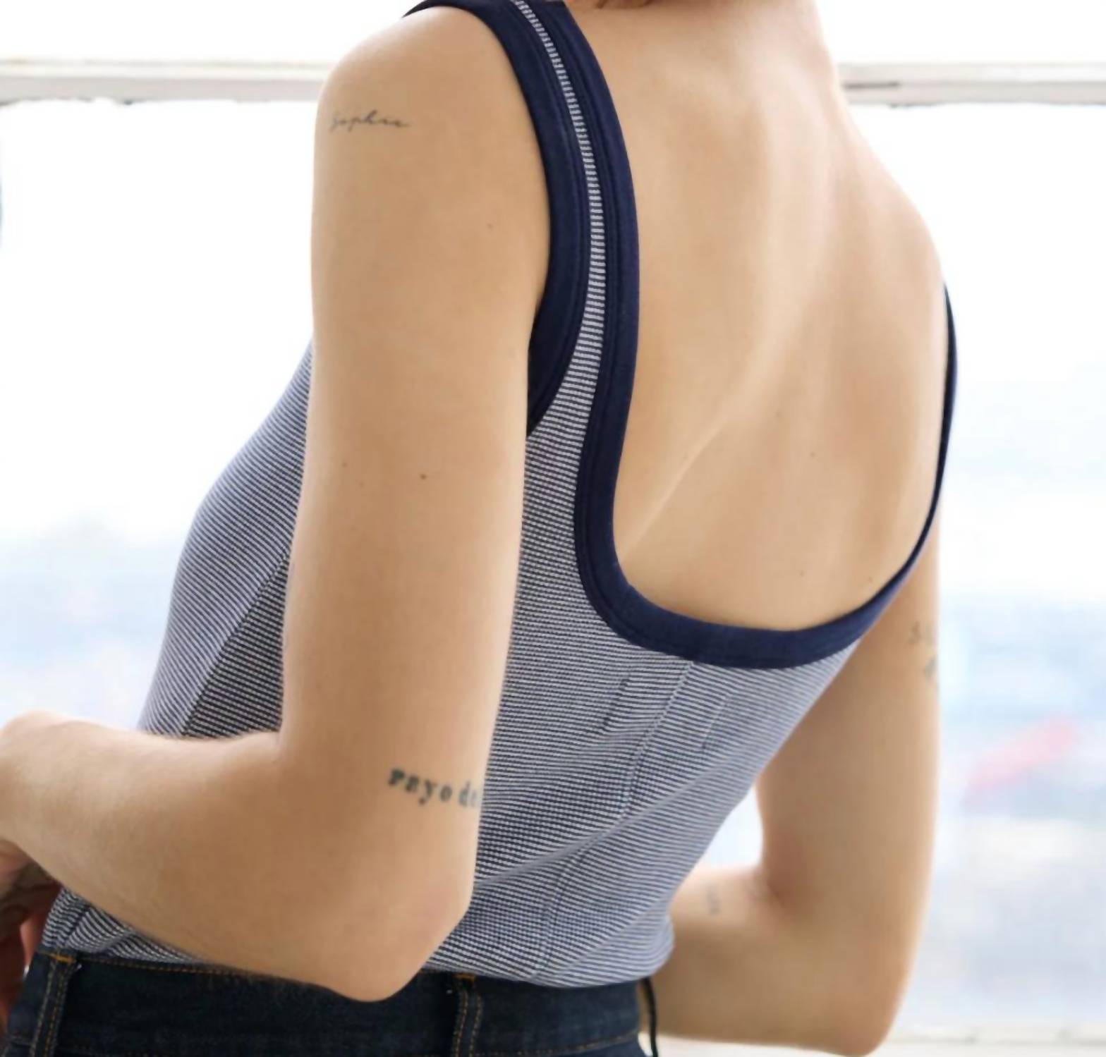This classic tank top is perfect for layering and cute enough to wear on its own. Introducing the Scoop It Up Tank Top by Sold Out NYC, a chic staple in Micro Stripe Navy. Designed with a flattering scoop neckline, this sleeveless tank features a minimalist stripe pattern and is crafted from a luxurious 97% Peruvian Cotton and 3% Elastane blend. Its pull-on closure ensures ease, while the breathable material makes it perfect for summer, whether on vacation or under a blazer. Care instructions recommend hand washing to maintain its quality and longevity.